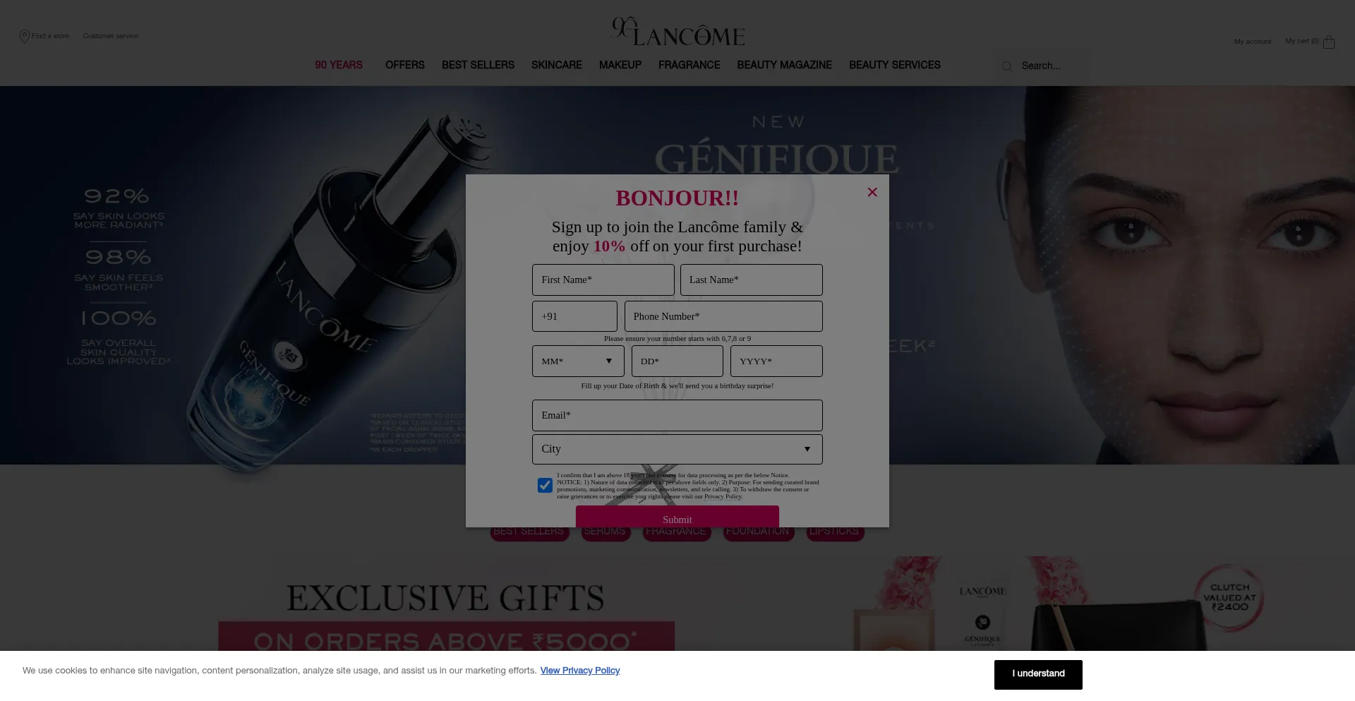 The website implements cookie consent mechanisms in compliance with privacy regulations such as GDPR or CCPA. This demonstrates that lancome.in adheres to data protection standards and provides users with control over personal data collection practices.