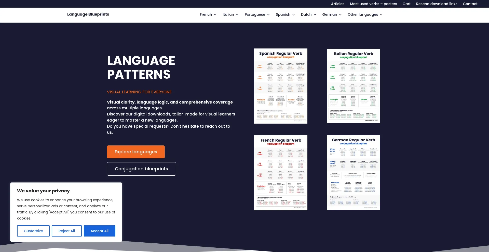 Learn languages fast with Language Blueprints - conjugation charts, most used verbs and more for Spanish, French, Portuguese, Italians & Dutch.