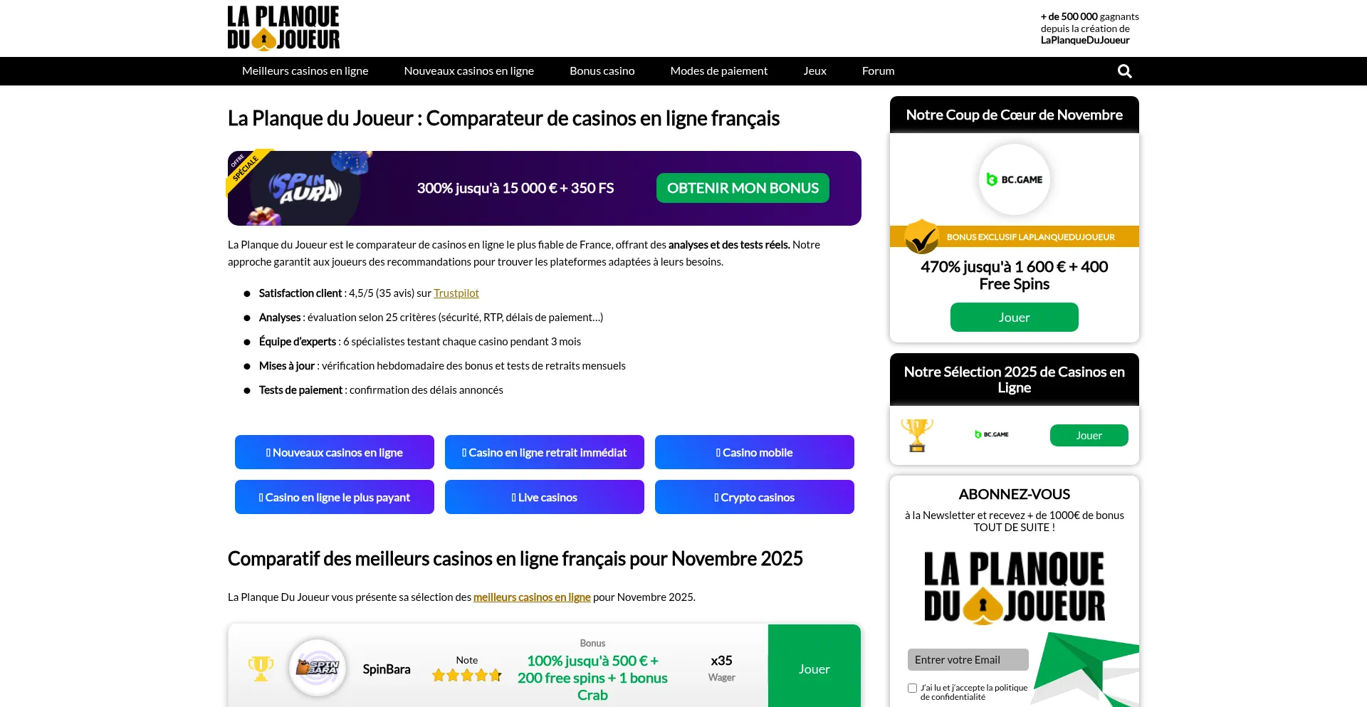 Comparateur Casino en Ligne N°1 - La Planque du Joueur