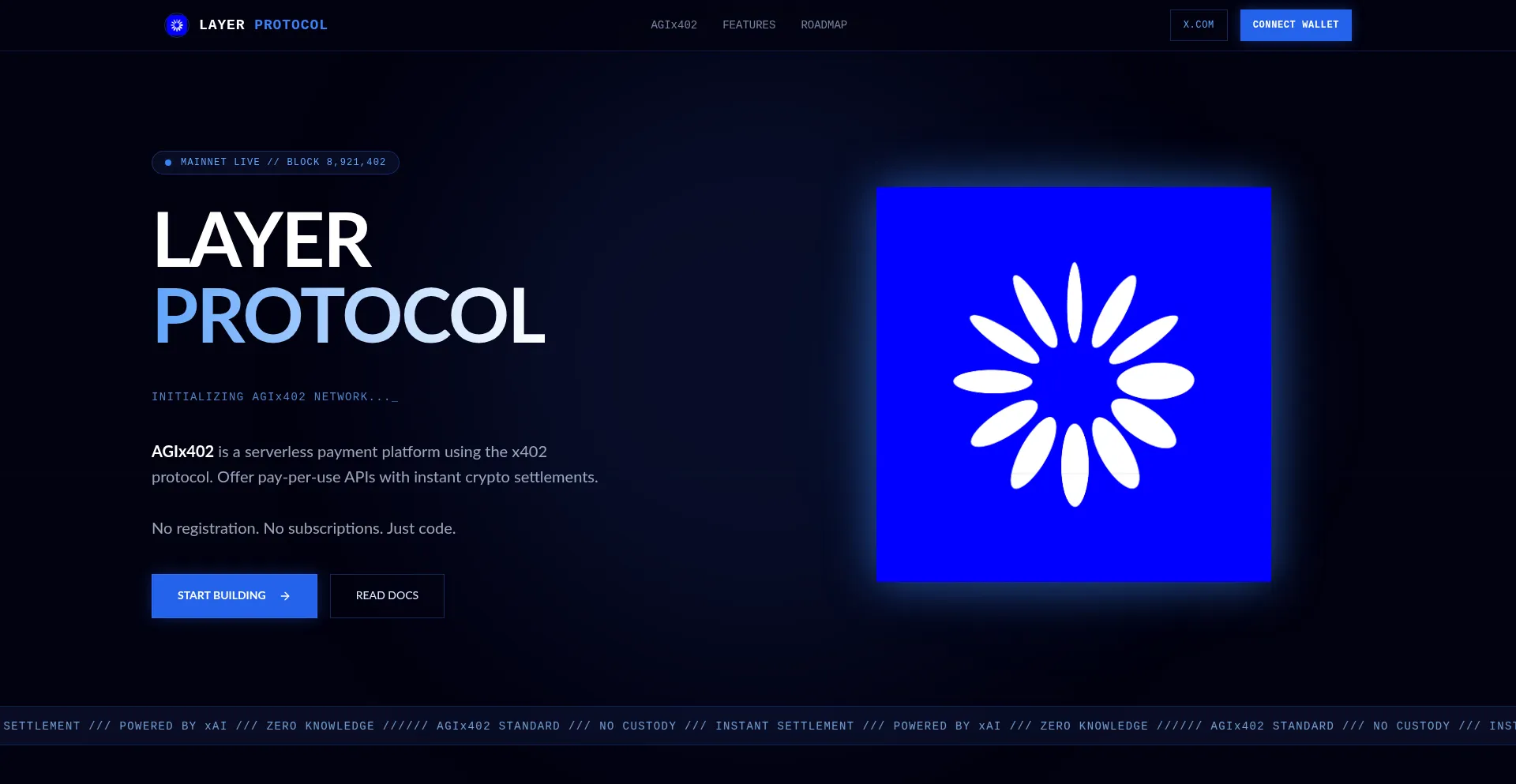 Layer Protocol: Serverless payment platform using the x402 protocol. LLM powered by xAI. Pay-per-use APIs with instant crypto settlements.