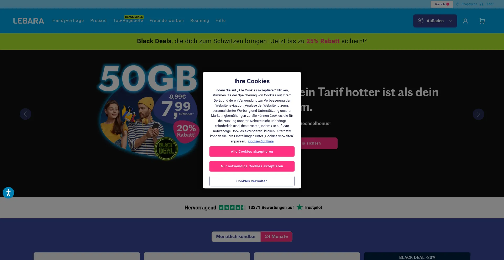 The website implements cookie consent mechanisms in compliance with privacy regulations such as GDPR or CCPA. This demonstrates that lebara.de adheres to data protection standards and provides users with control over personal data collection practices.