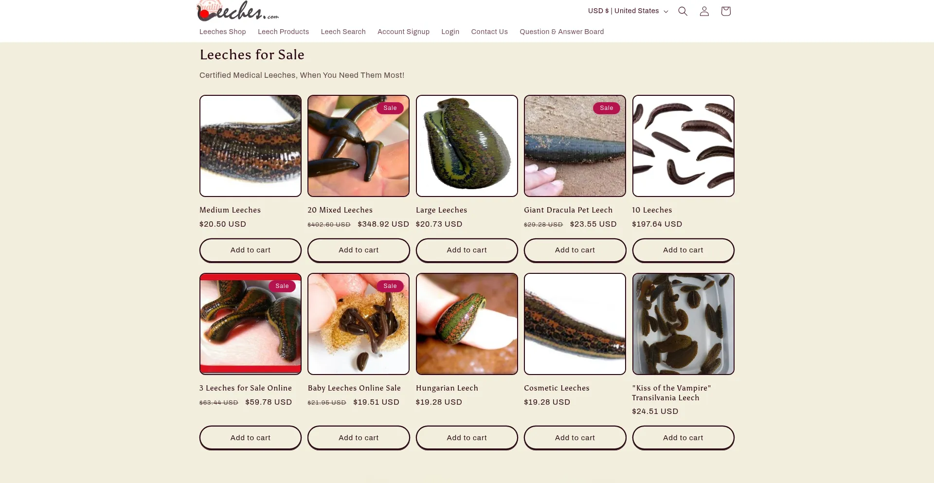 Analysis indicates that leeches.com operates as an e-commerce platform facilitating online transactions for goods or services. The website implements shopping cart functionality, payment processing systems, and product catalog features typical of commercial retail operations.