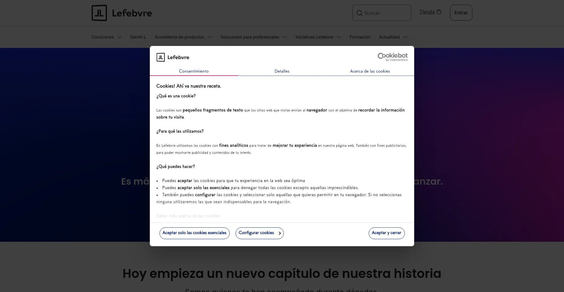 The website implements cookie consent mechanisms in compliance with privacy regulations such as GDPR or CCPA. This demonstrates that lefebvre.es adheres to data protection standards and provides users with control over personal data collection practices.