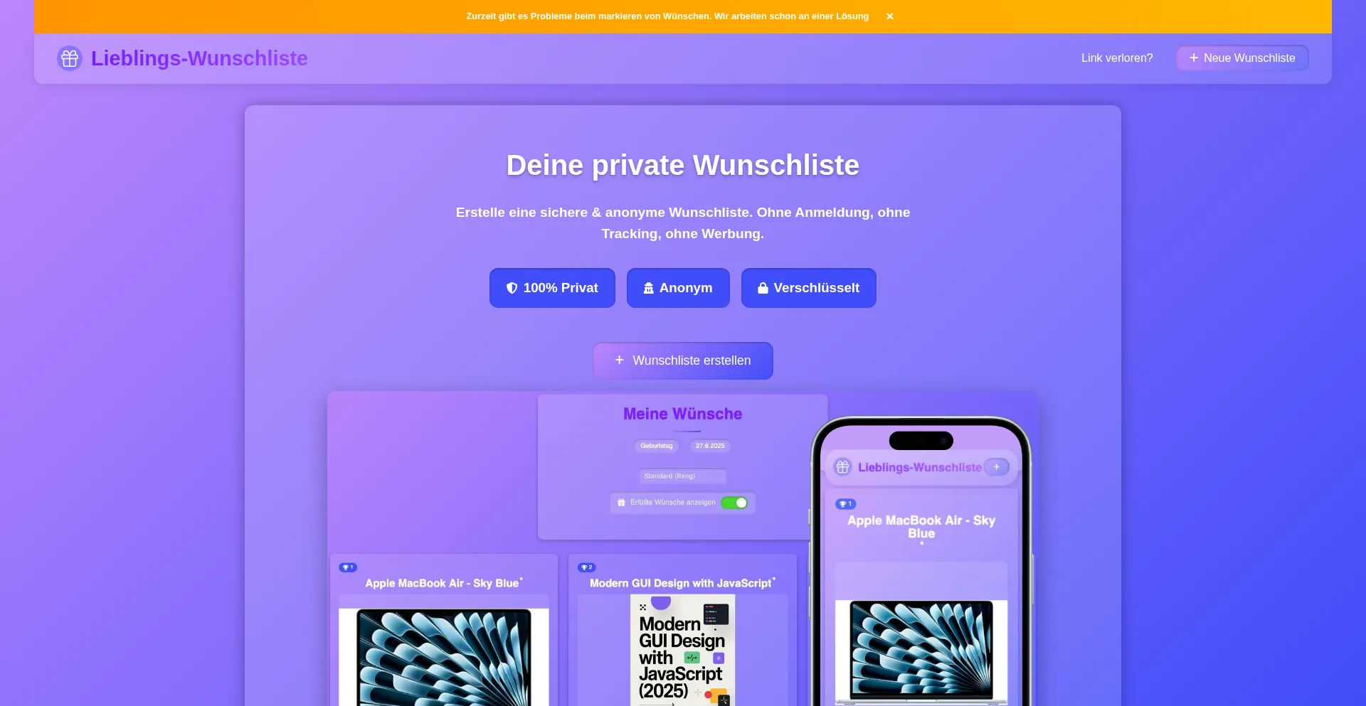 Erstelle deine private Online-Wunschliste. 100% anonym, ohne Tracking und ohne Anmeldung. Sicher teilen mit Ende-zu-Ende-Verschlüsselung.