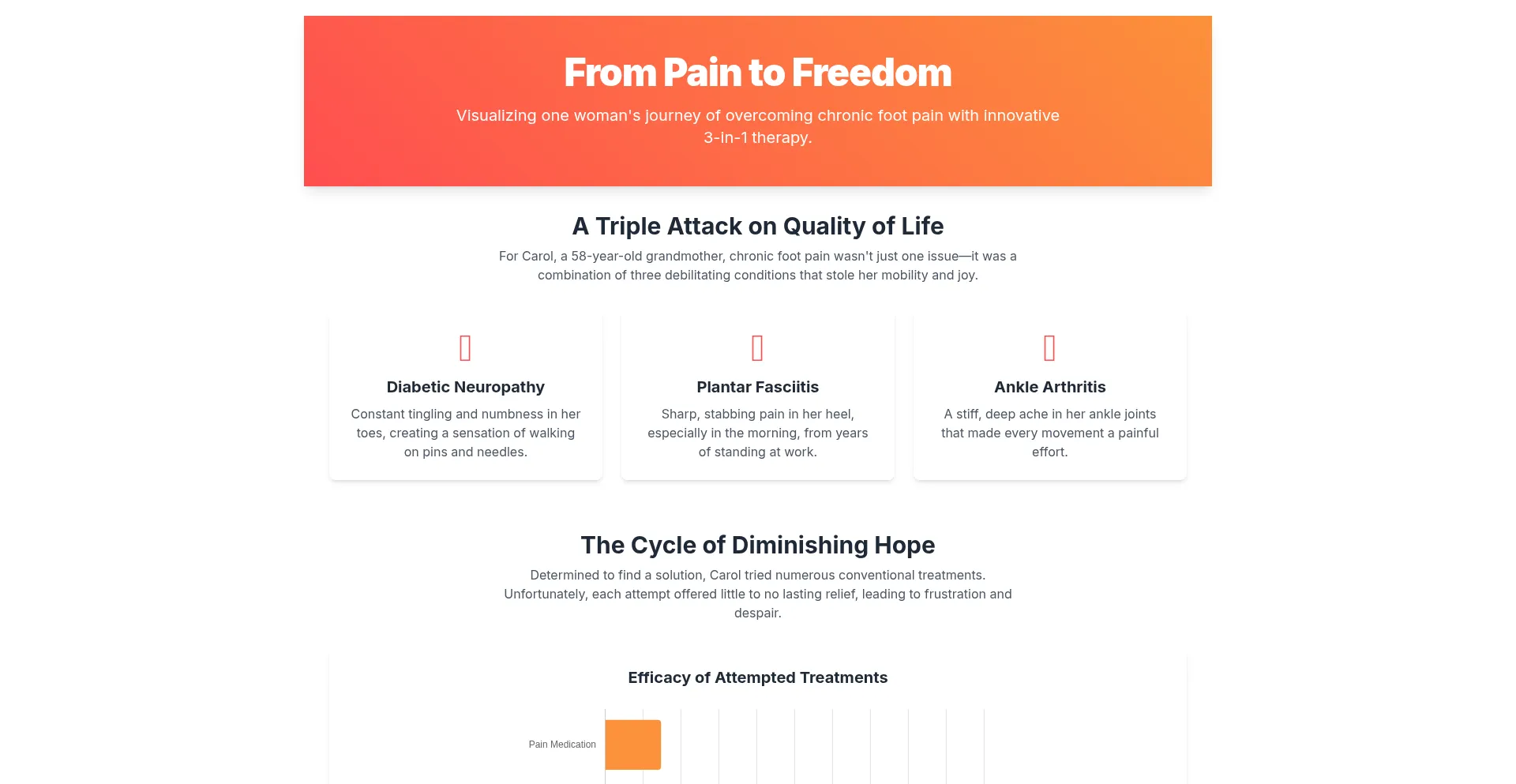 Visualizing one woman's journey of overcoming chronic foot pain with innovative 3-in-1 therapy.