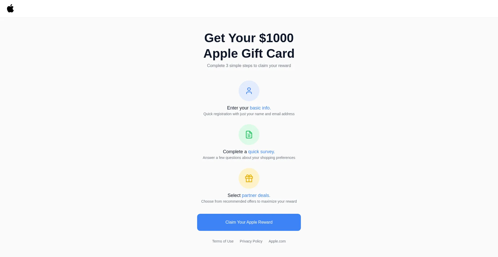 Complete 3 simple steps to claim your $1000 Apple Gift Card. Quick registration, survey, and partner deals to maximize your reward.