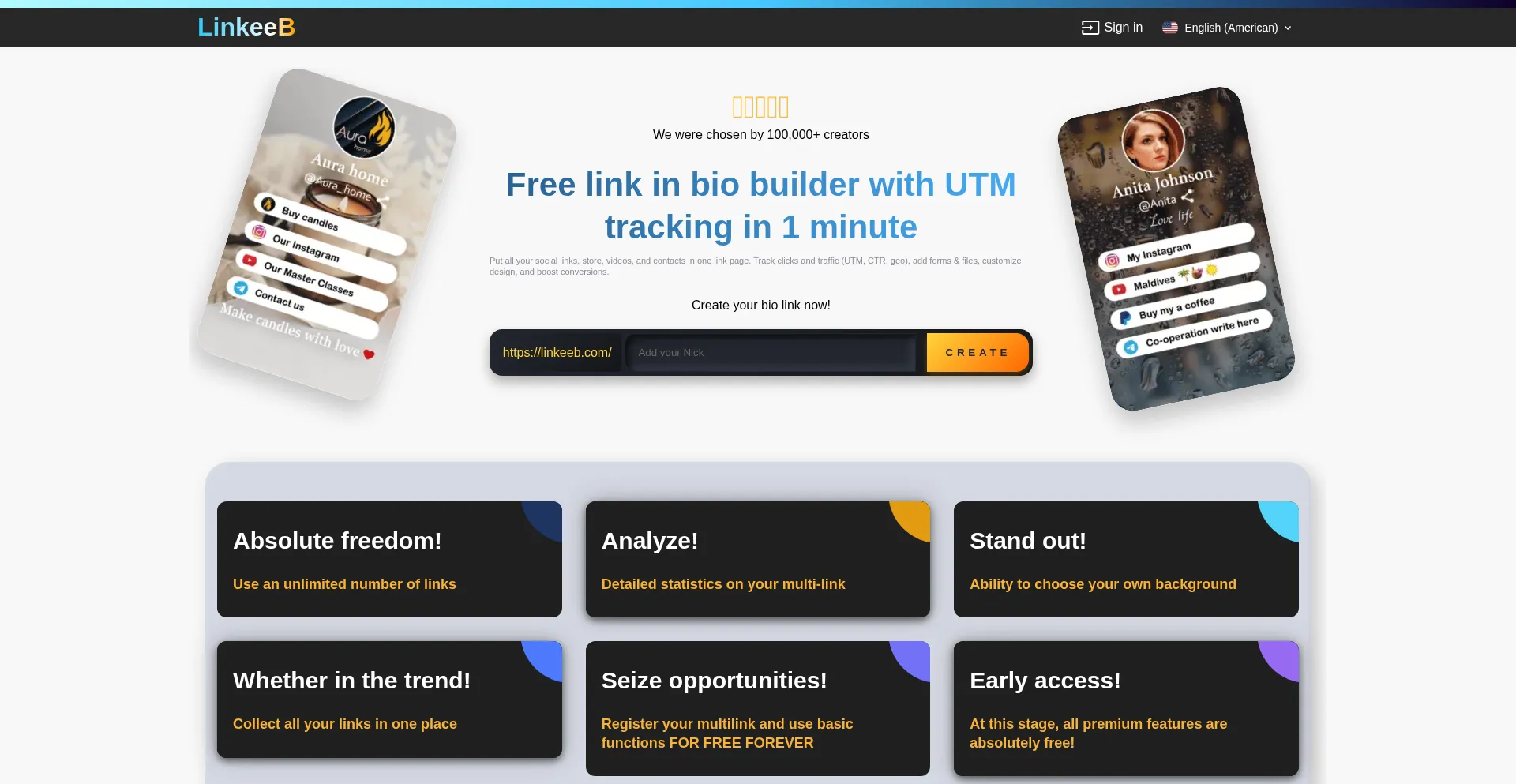 Create one simple link page for Instagram, TikTok, YouTube & Telegram. Set up in 1 minute, track clicks (CTR, traffic sources, geo), add UTM tags, and customize design.