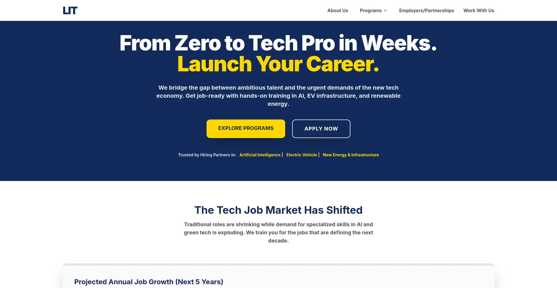 LIT offers hands-on training and certification in high- growth fields like Al Engineering, EV Technology, Solar Installation, and more. Launch your tech career in weeks, not years.