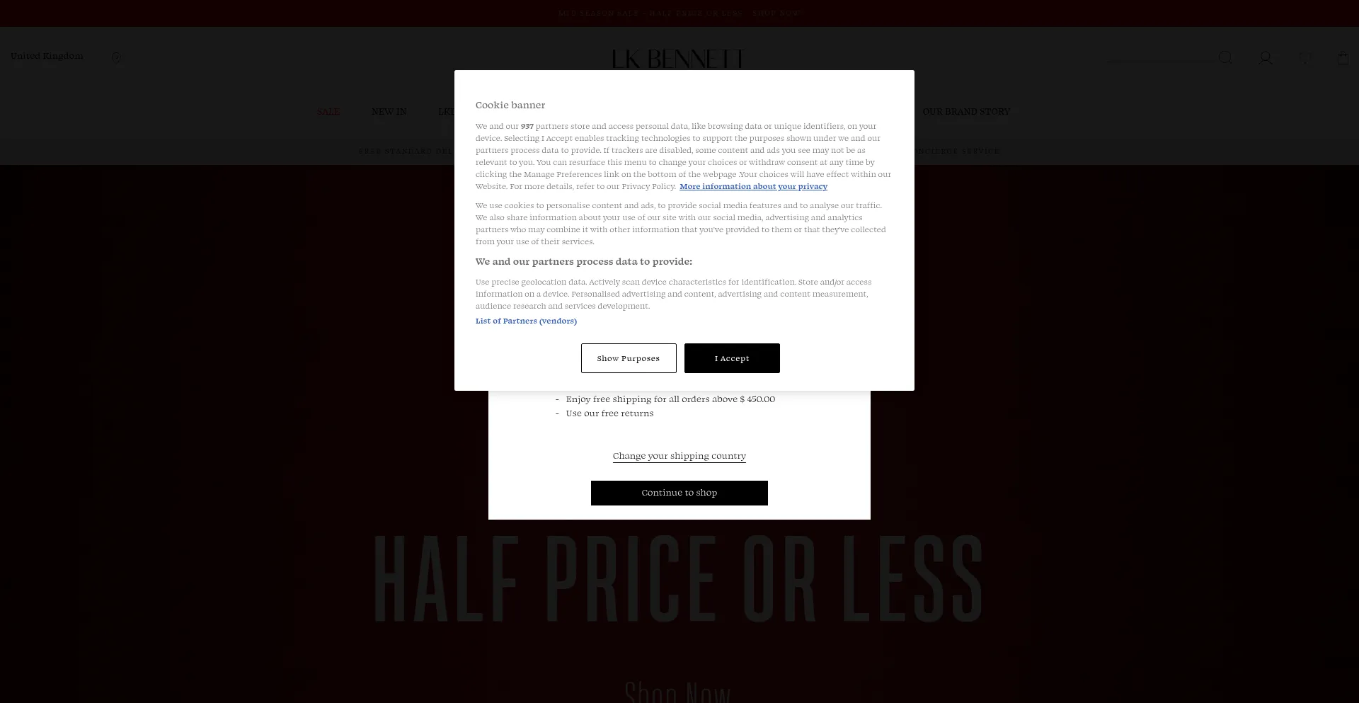 The website implements cookie consent mechanisms in compliance with privacy regulations such as GDPR or CCPA. This demonstrates that lkbennett.com adheres to data protection standards and provides users with control over personal data collection practices.