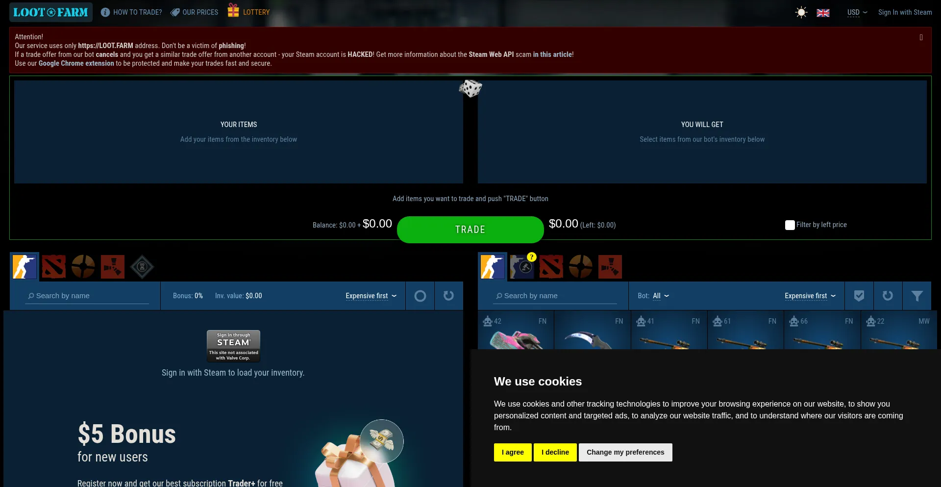 Discover LOOT.Farm for secure, seamless skin trading in CS 2, DOTA 2, TF2, and RUST. Experience our vast inventory & advanced trading technology.