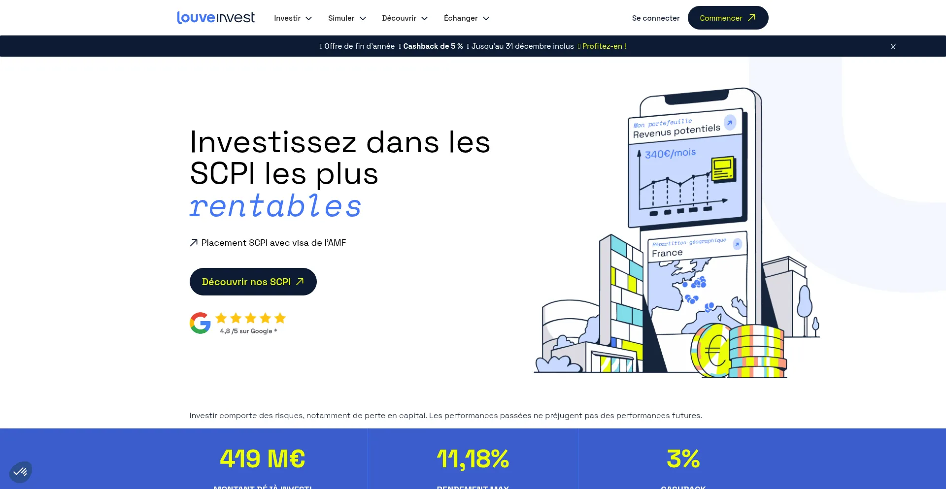 Choisissez parmi + de 60 SCPI, investissez selon nos conseils d’experts et percevez 3 % de cashback sur votre compte bancaire.