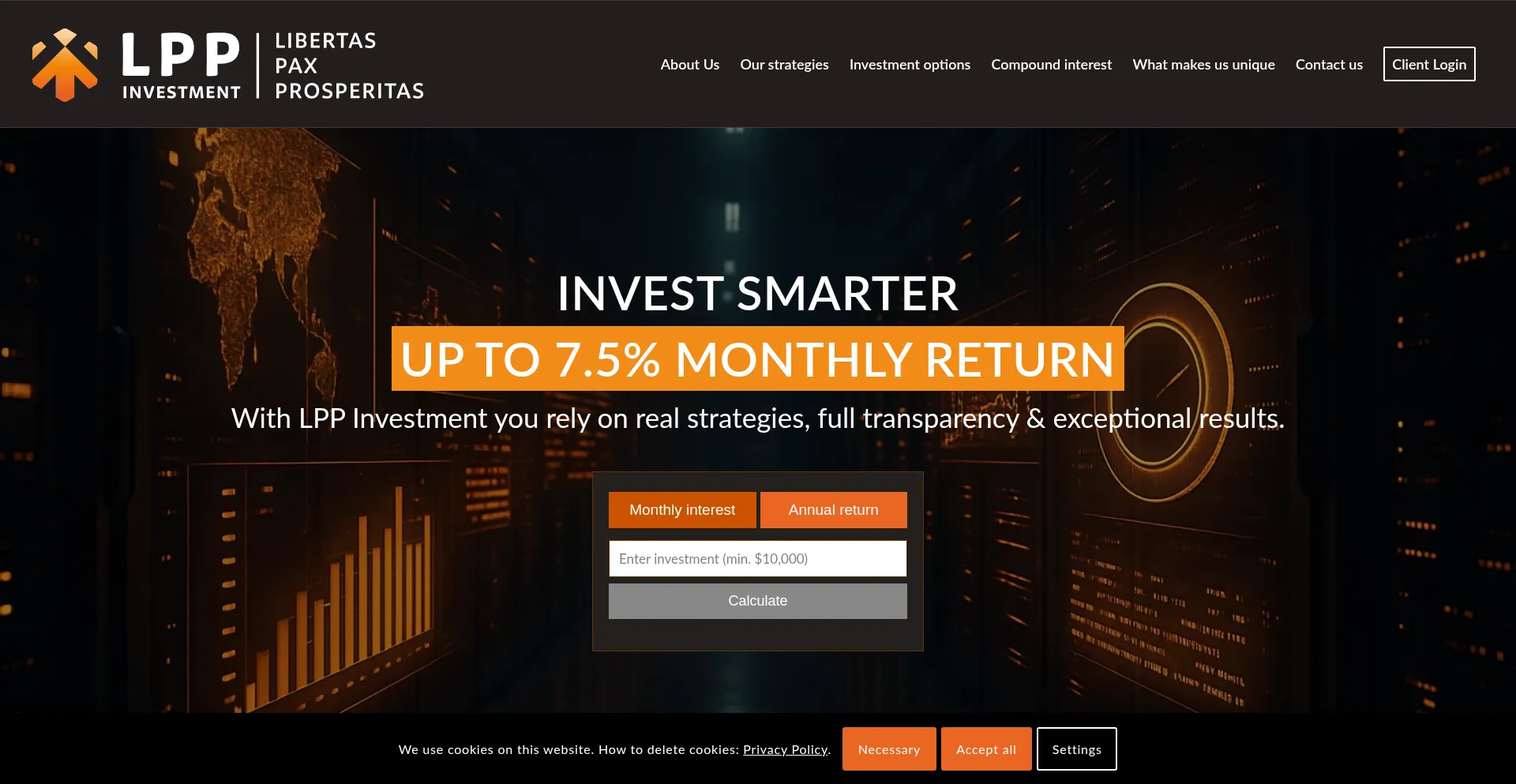 The lpp-investment.com website provides financial services including investment management, wealth advisory, or financial planning solutions. Services may encompass portfolio management, investment opportunities, financial consulting, or asset growth strategies for individual and institutional clients.