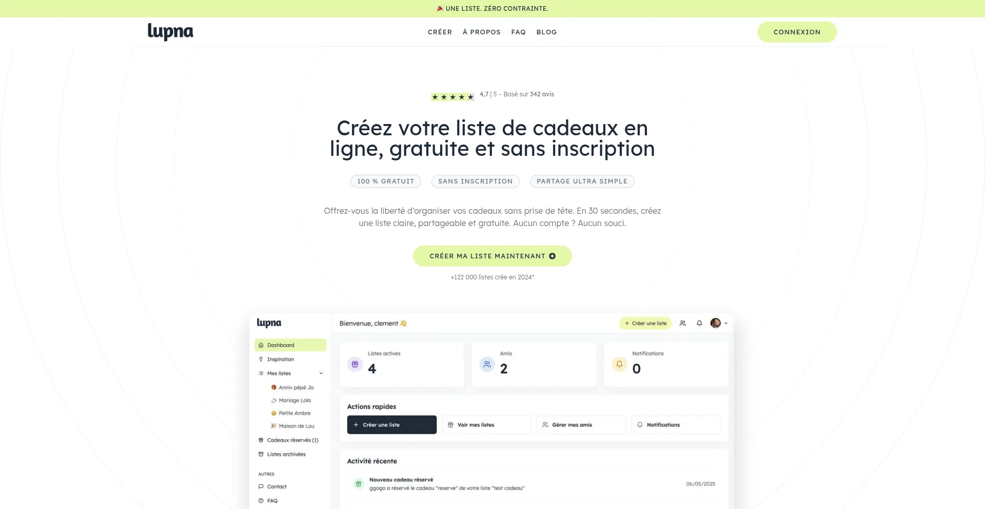 Créez gratuitement votre liste de cadeaux pour naissance, anniversaire, mariage, etc. Partagez sans inscription, recevez ce qui vous plaît.