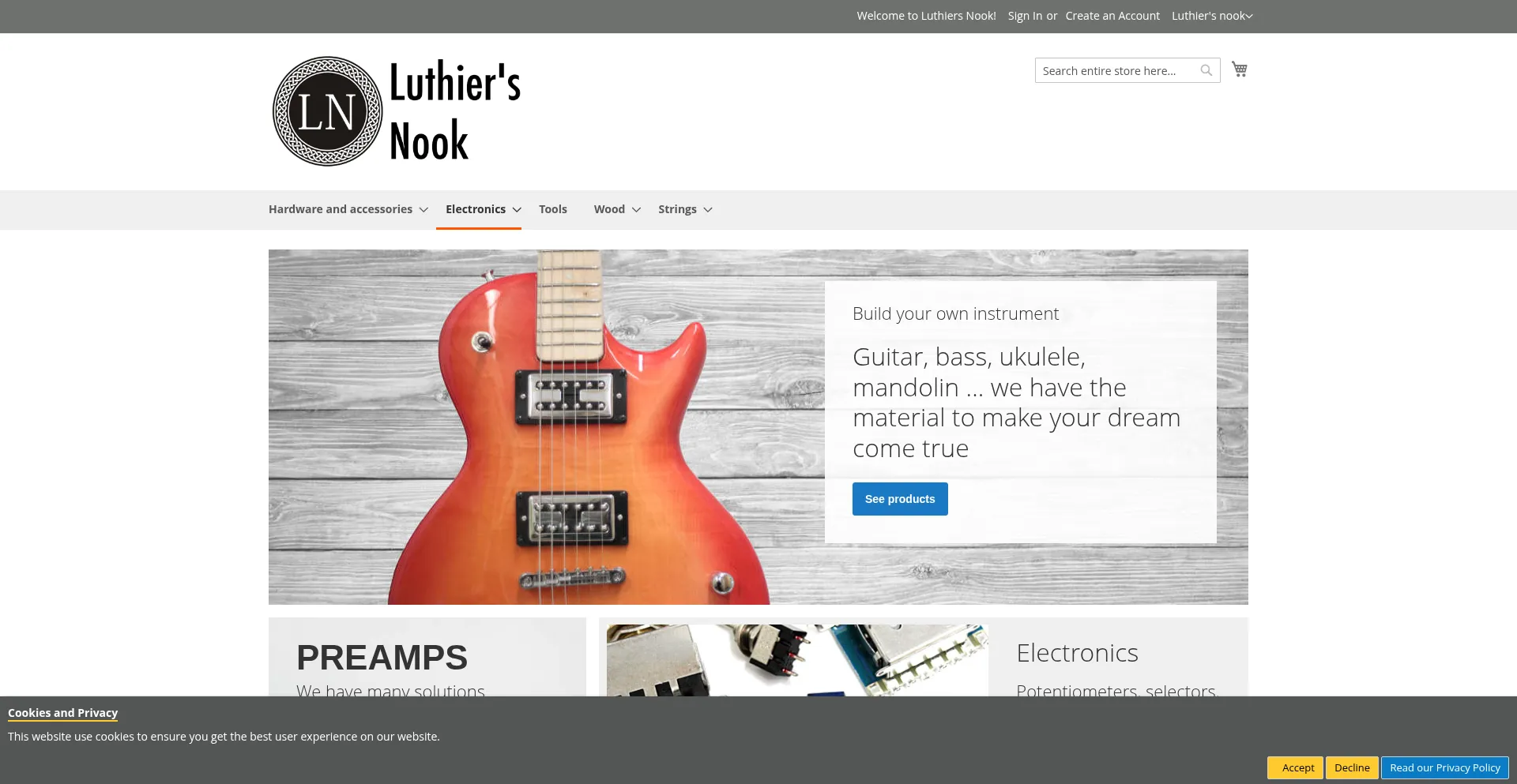 Analysis indicates that luthiersnook.com operates as an e-commerce platform facilitating online transactions for goods or services. The website implements shopping cart functionality, payment processing systems, and product catalog features typical of commercial retail operations.