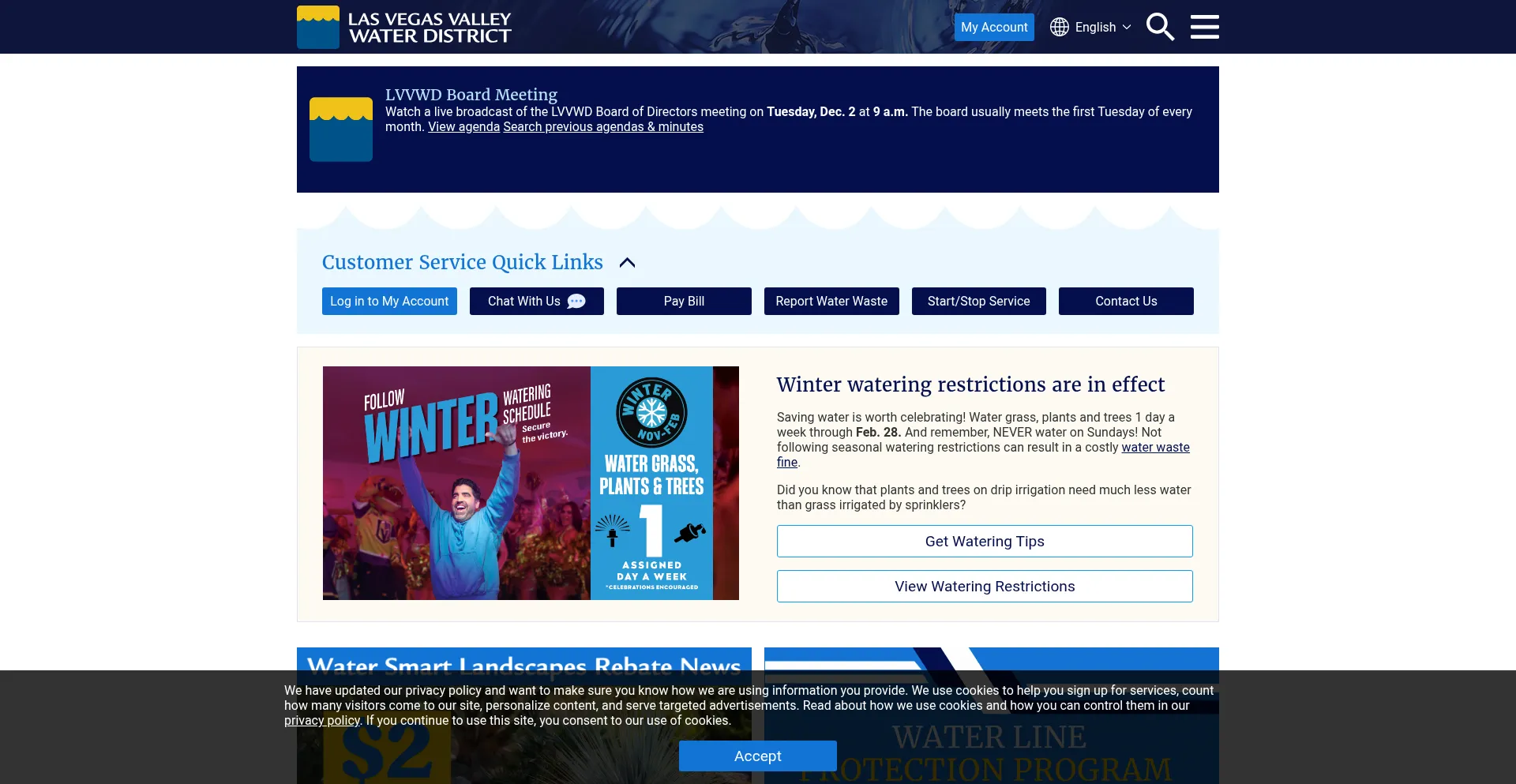 Visit the Las Vegas Valley Water District Web site to pay your water bill, sign up for or stop water service, find your watering group and get water conservation tips.