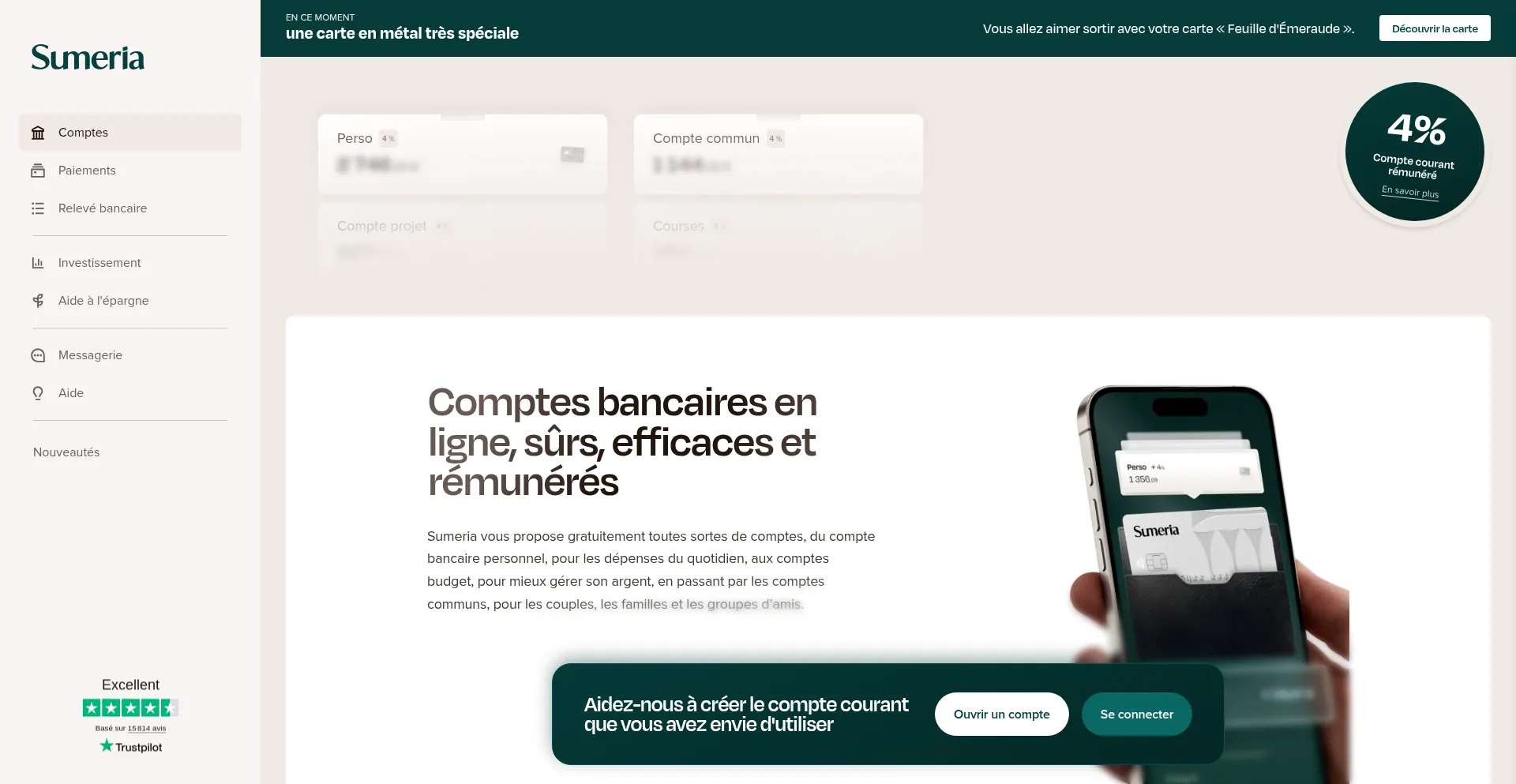 Sumeria vous propose gratuitement toutes sortes de comptes, du compte bancaire personnel, pour les dépenses du quotidien, aux comptes budget, pour mieux gérer son argent, en p...