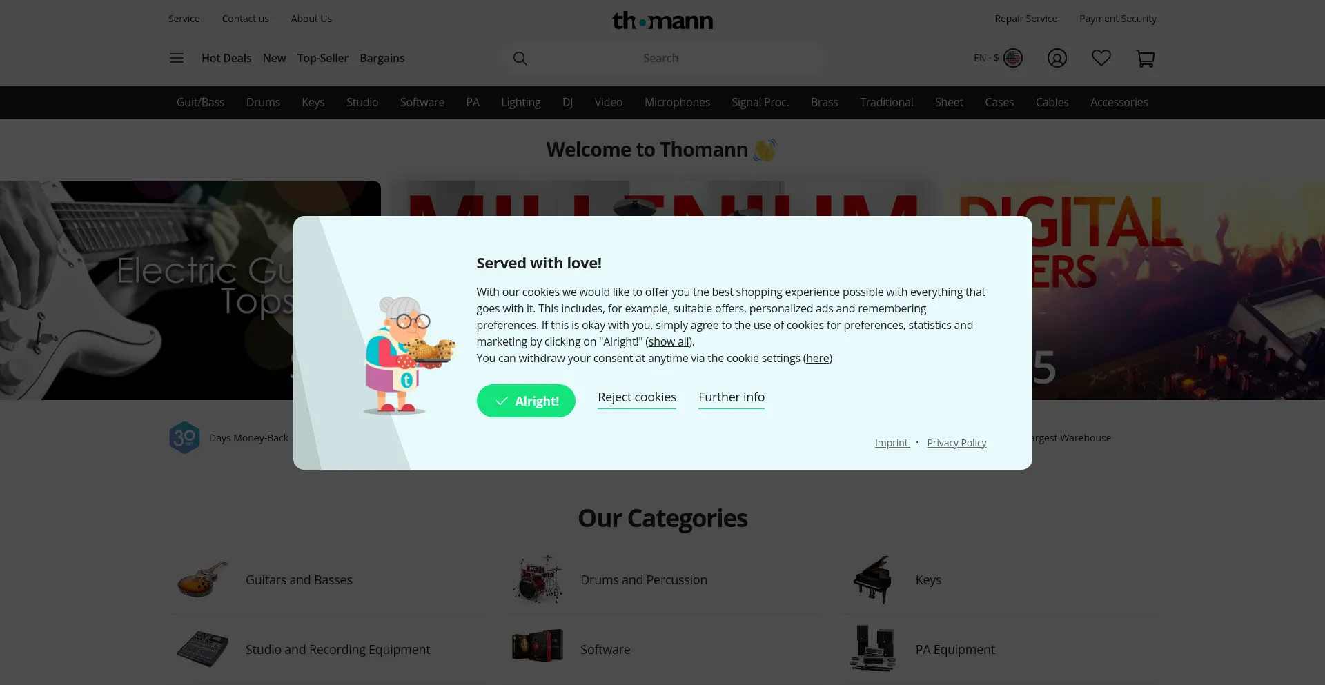The website implements cookie consent mechanisms in compliance with privacy regulations such as GDPR or CCPA. This demonstrates that m.thomann.de adheres to data protection standards and provides users with control over personal data collection practices.