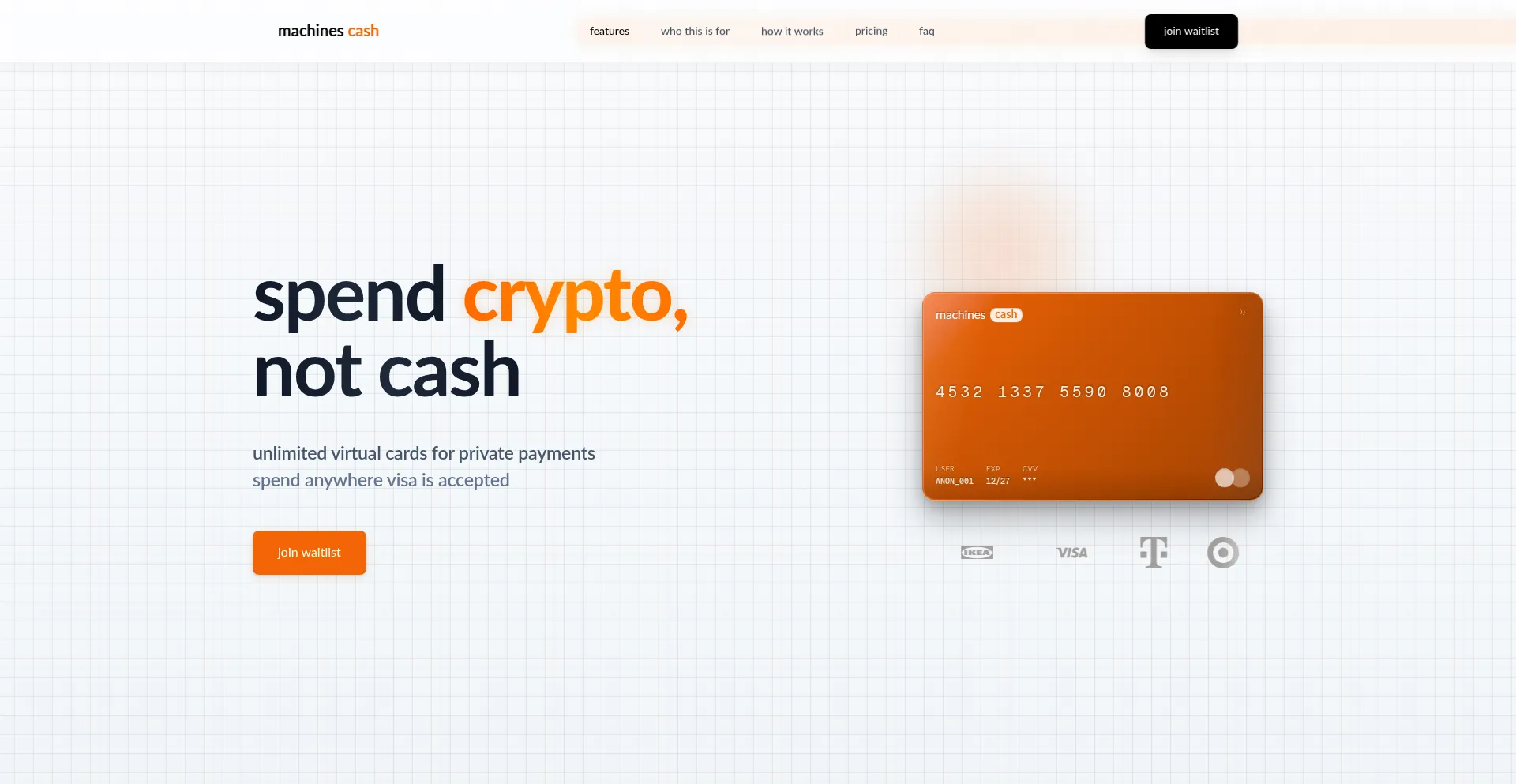 unlimited virtual cards for private crypto payments. spend anywhere visa is accepted. like apple's hide my email, for crypto payments.