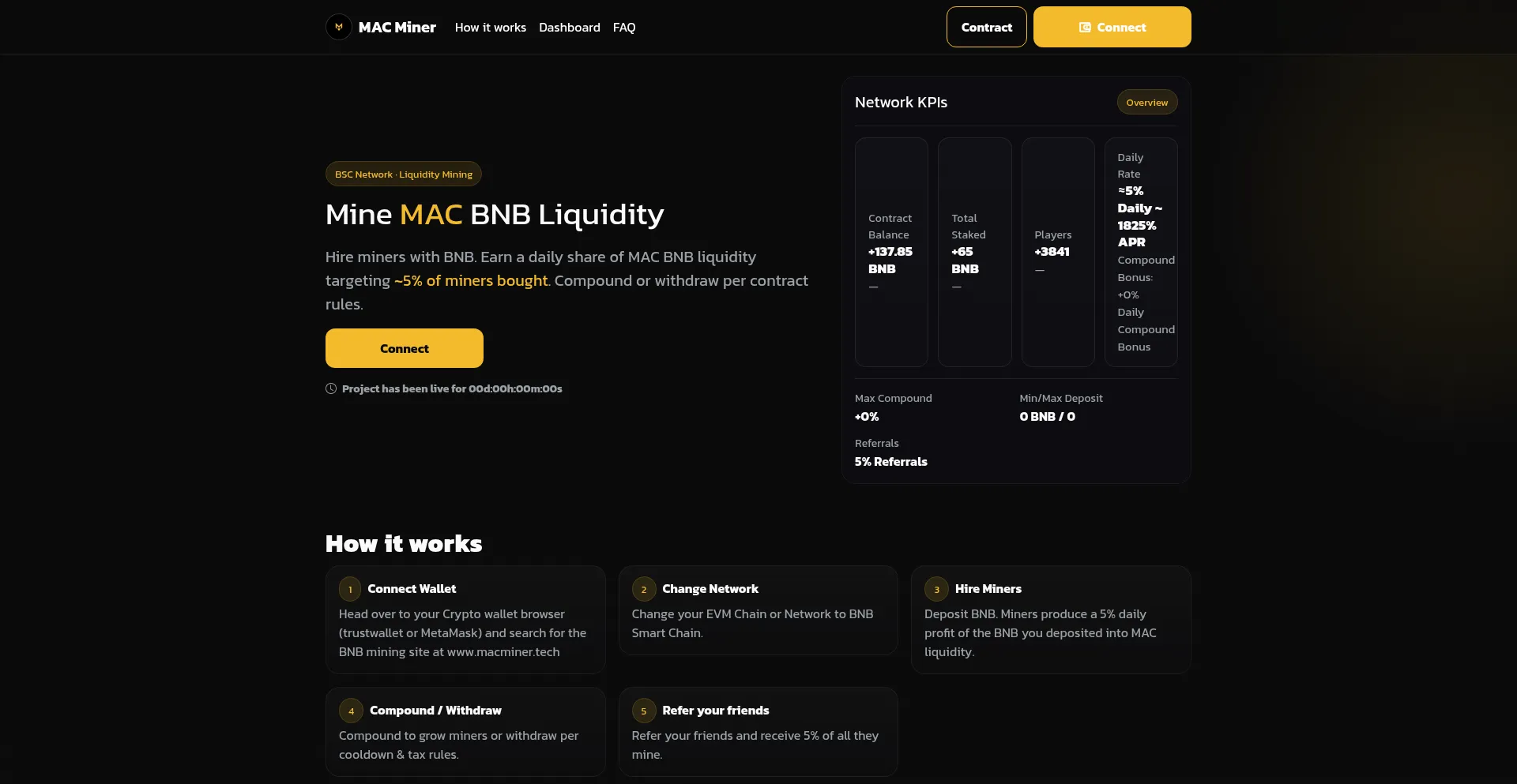 Deposit BNB to hire miners and earn a daily share of MAC liquidity. Target ~5% daily of miners bought.