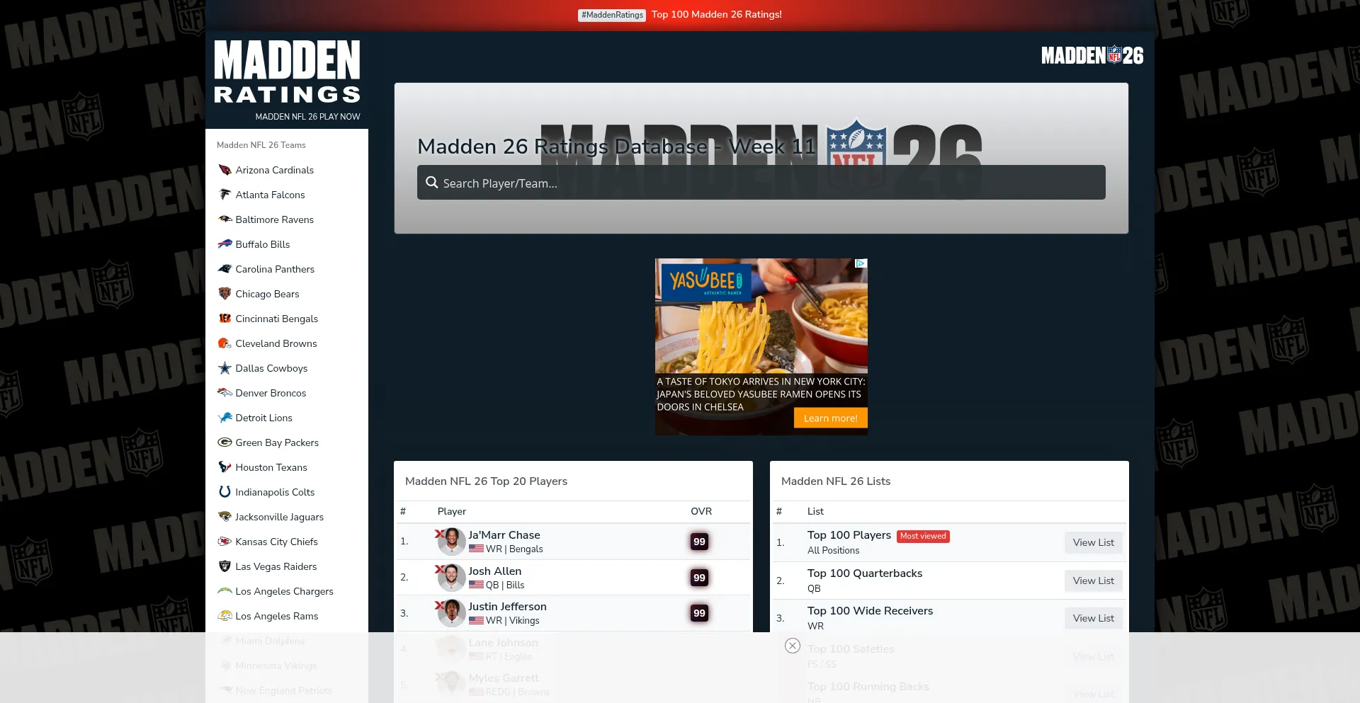 Madden 26 Play Now Players and Teams Ratings Database - MaddenRatings.com is updated regularly.
