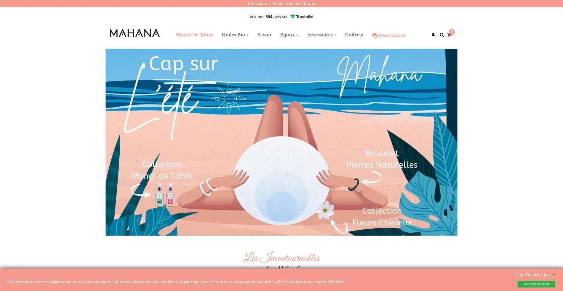 Analysis indicates that mahana-monoi.com operates as an e-commerce platform facilitating online transactions for goods or services. The website implements shopping cart functionality, payment processing systems, and product catalog features typical of commercial retail operations.