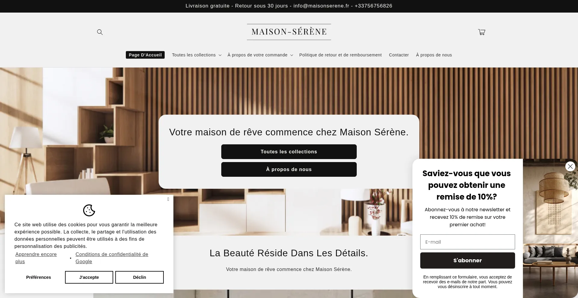 Analysis indicates that maisonserene.fr operates as an e-commerce platform facilitating online transactions for goods or services. The website implements shopping cart functionality, payment processing systems, and product catalog features typical of commercial retail operations.
