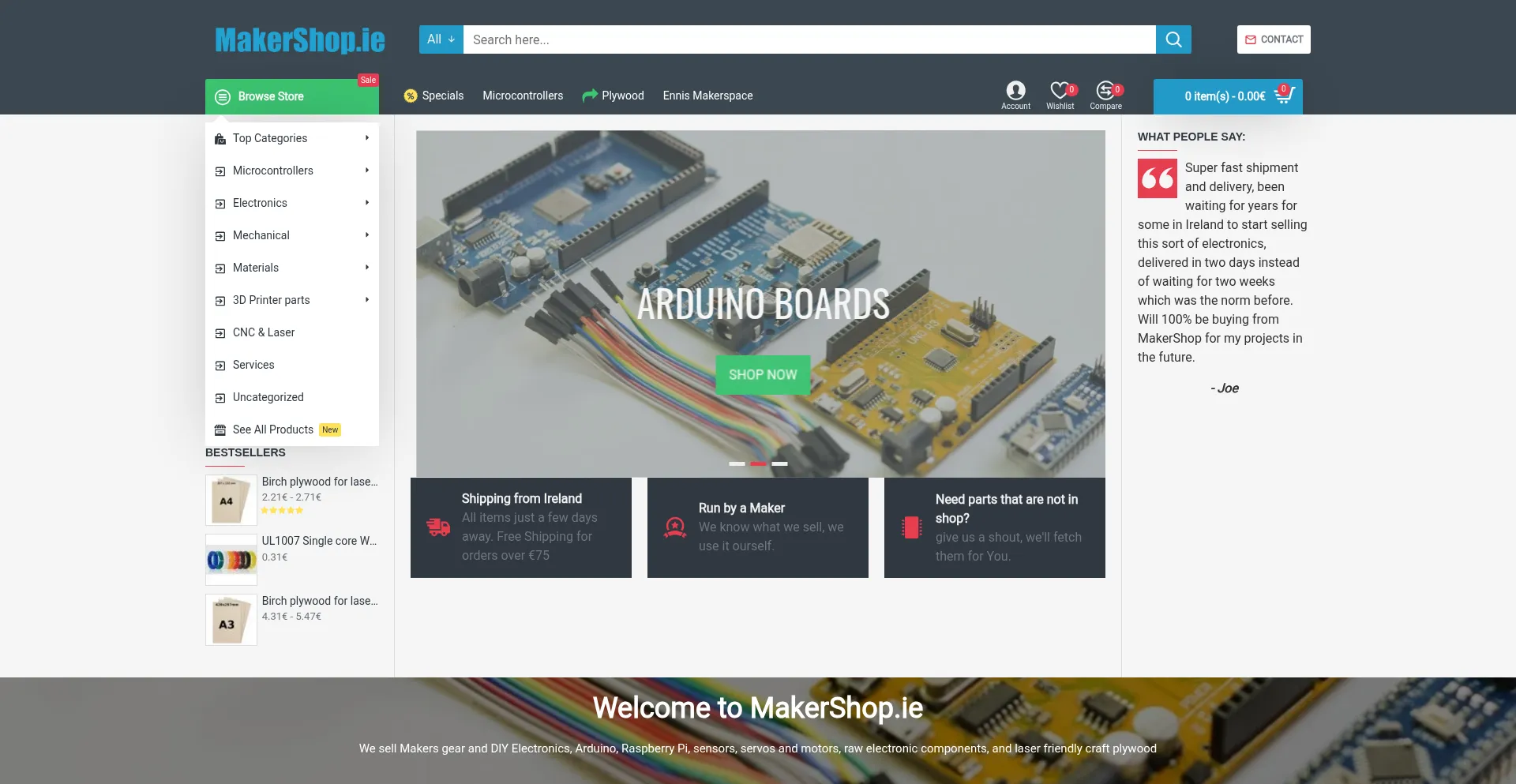 We sell Makers gear and DIY Electronics, Arduino, Raspberry Pi, sensors, servos and motors, raw electronic components, and laser friendly craft plywood. Run by a Maker.