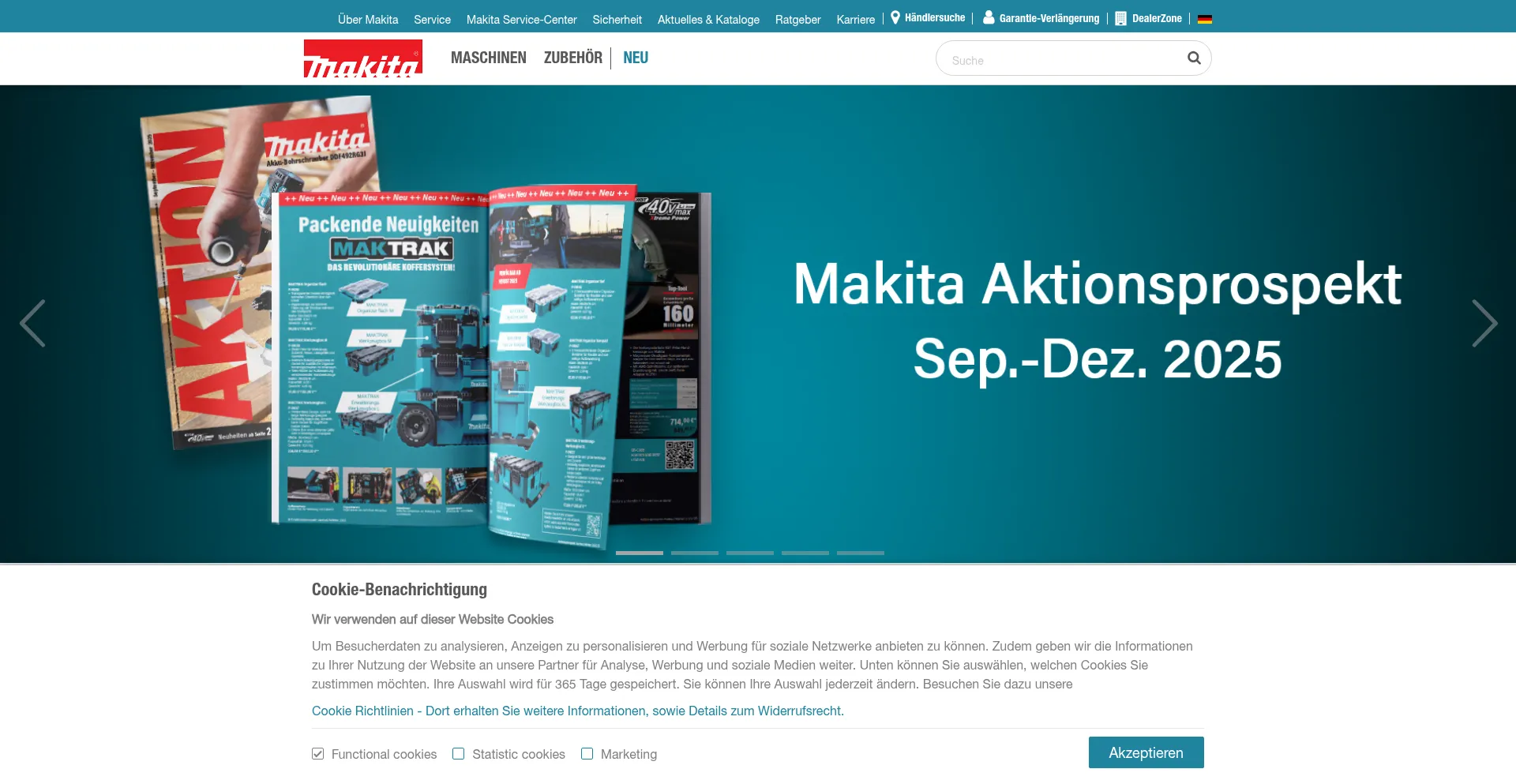 Analysis indicates that makita.de operates as an e-commerce platform facilitating online transactions for goods or services. The website implements shopping cart functionality, payment processing systems, and product catalog features typical of commercial retail operations.