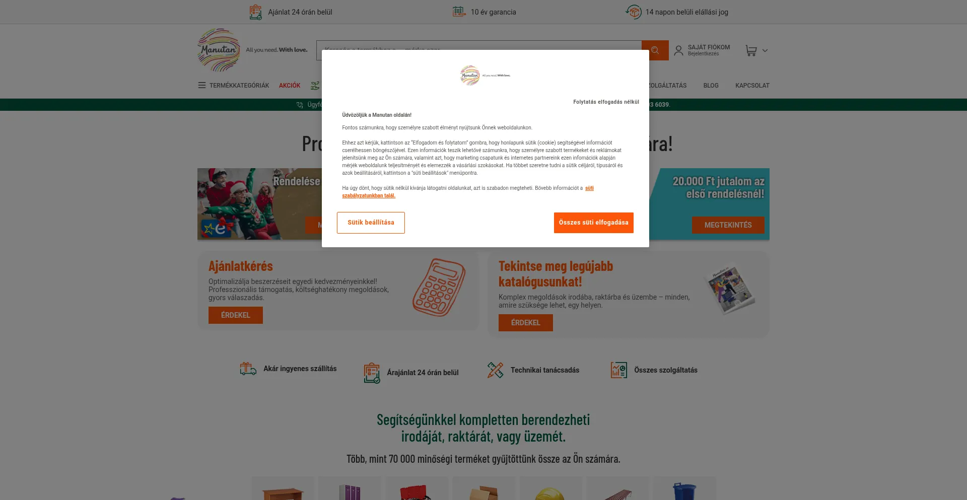 The website implements cookie consent mechanisms in compliance with privacy regulations such as GDPR or CCPA. This demonstrates that manutan.hu adheres to data protection standards and provides users with control over personal data collection practices.