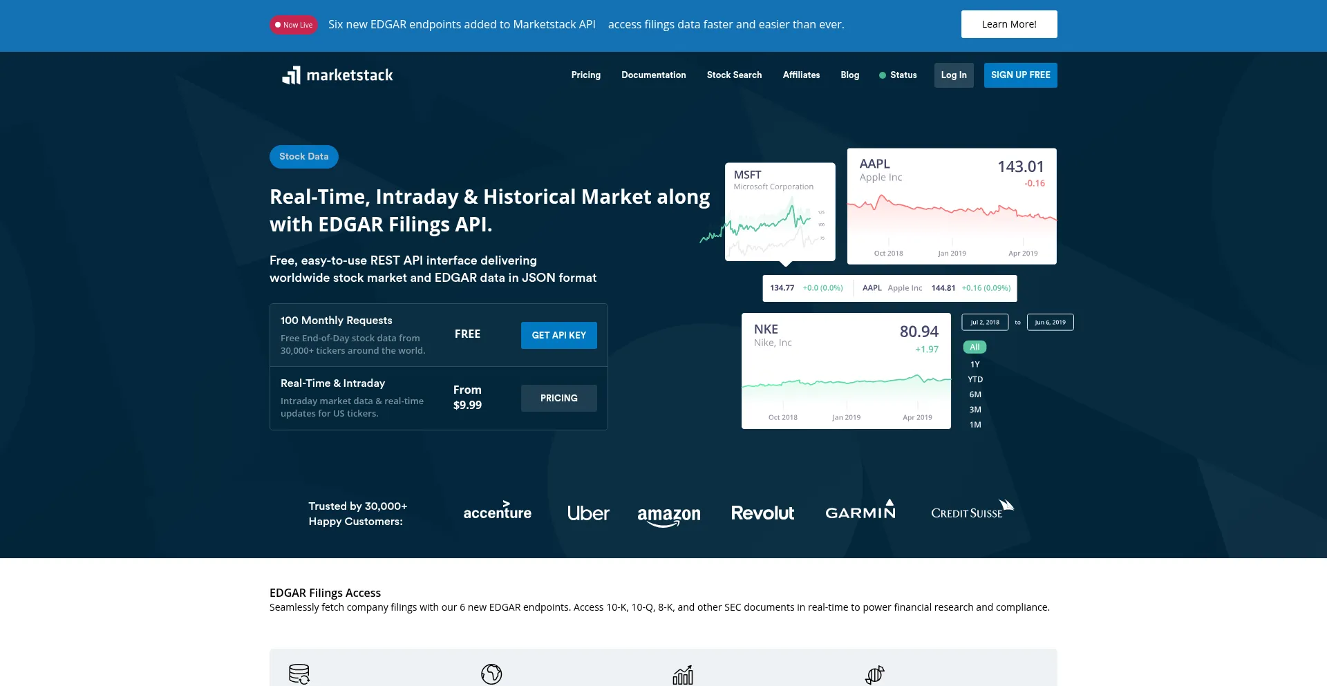 Access free stock data API offering real-time and historical market data for global exchanges. Marketstack provides fast, reliable stock price API solutions.