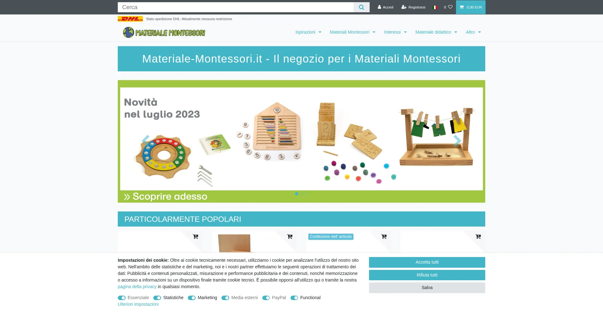 Analysis indicates that materiale-montessori.it operates as an e-commerce platform facilitating online transactions for goods or services. The website implements shopping cart functionality, payment processing systems, and product catalog features typical of commercial retail operations.
