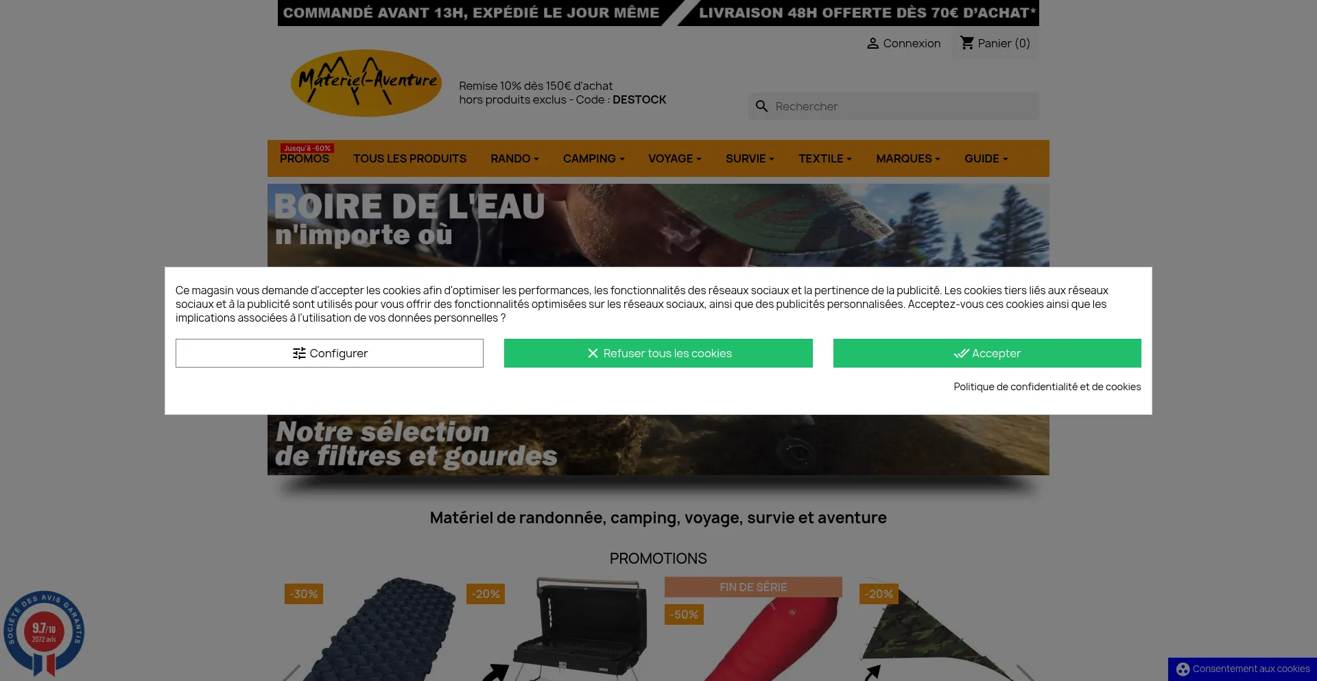 The website implements cookie consent mechanisms in compliance with privacy regulations such as GDPR or CCPA. This demonstrates that materiel-aventure.fr adheres to data protection standards and provides users with control over personal data collection practices.