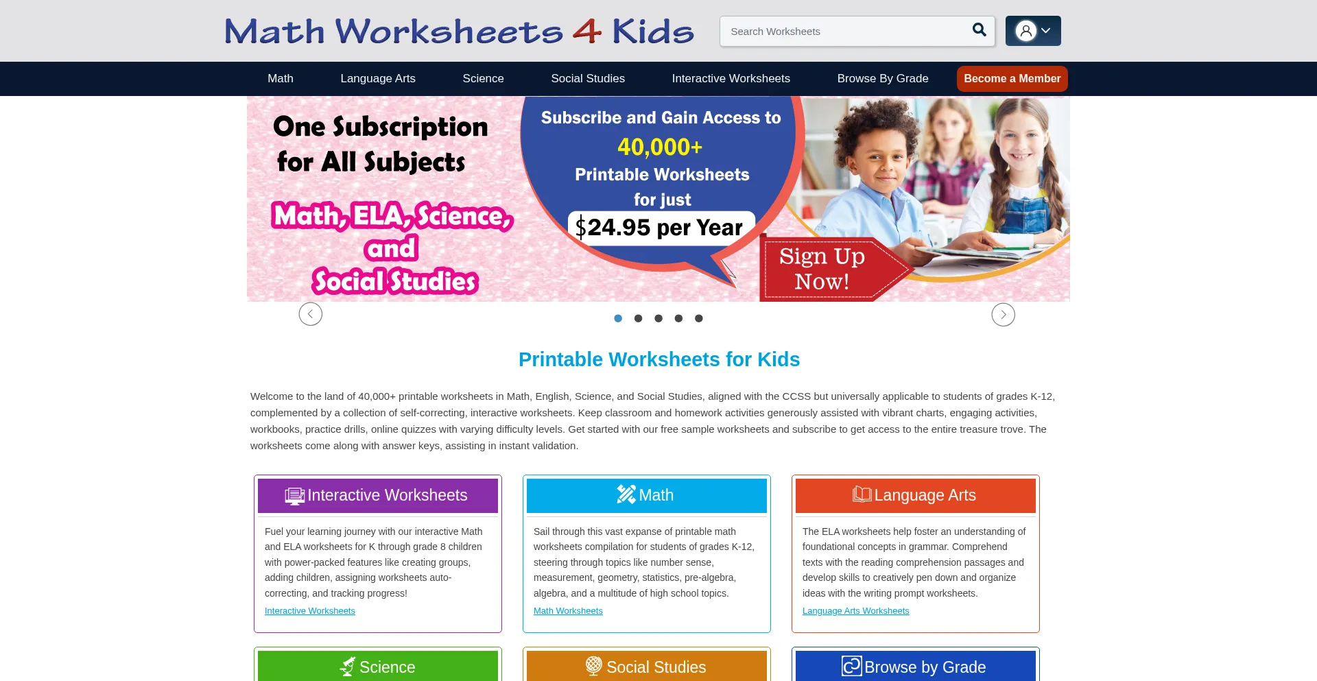 Math Worksheets 4 Kids offers free printable K-12 worksheets in English, Math, Science and Social Studies with PDFs drafted for children and teachers.