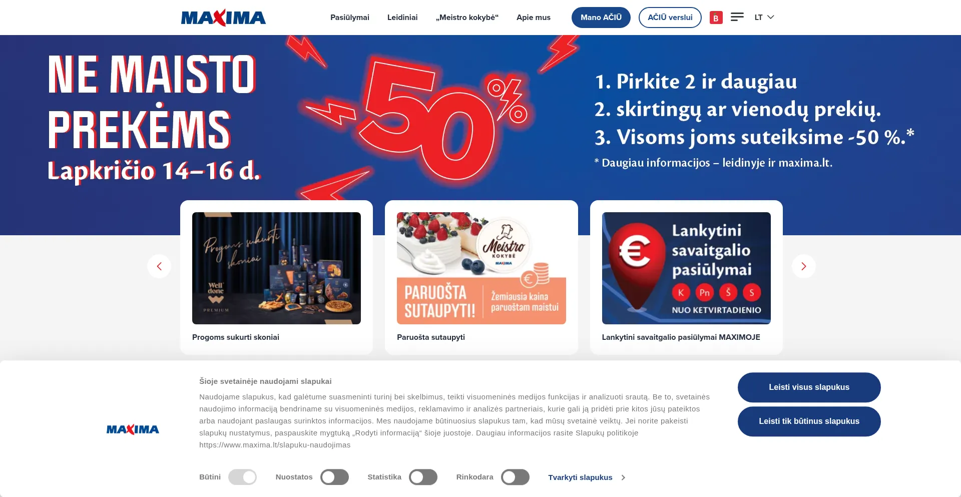 The website implements cookie consent mechanisms in compliance with privacy regulations such as GDPR or CCPA. This demonstrates that maxima.lt adheres to data protection standards and provides users with control over personal data collection practices.