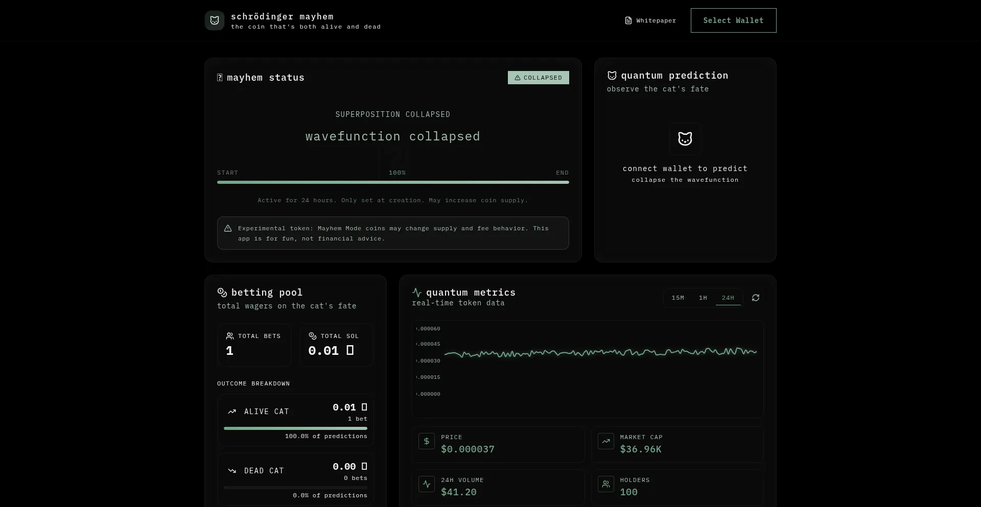 Mayhem Schrödinger - A community prediction game for First Mayhem Cat token on Pump.fun