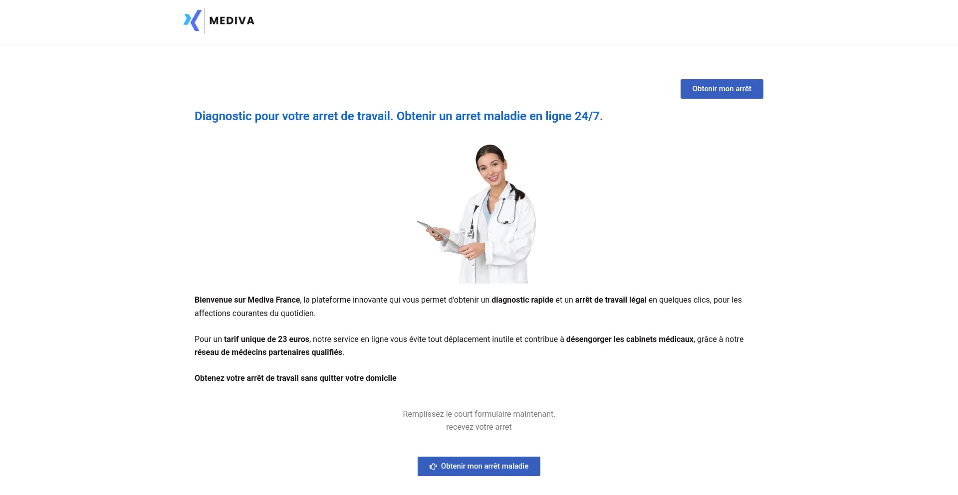 Bienvenue sur Mediva France, la plateforme innovante qui vous permet d’obtenir un diagnostic rapide et un arrêt de travail légal en quelques clics, pour les affections coura...