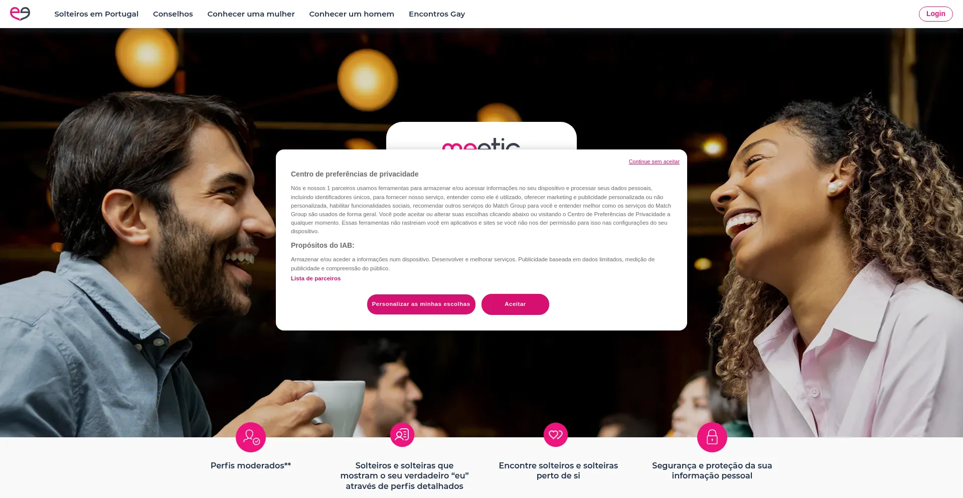 Meetic é o maior site de encontros e de chat na Europa. Aqui poderás conversar, fazer amizades, encontrar a tua cara-metade e o amor!