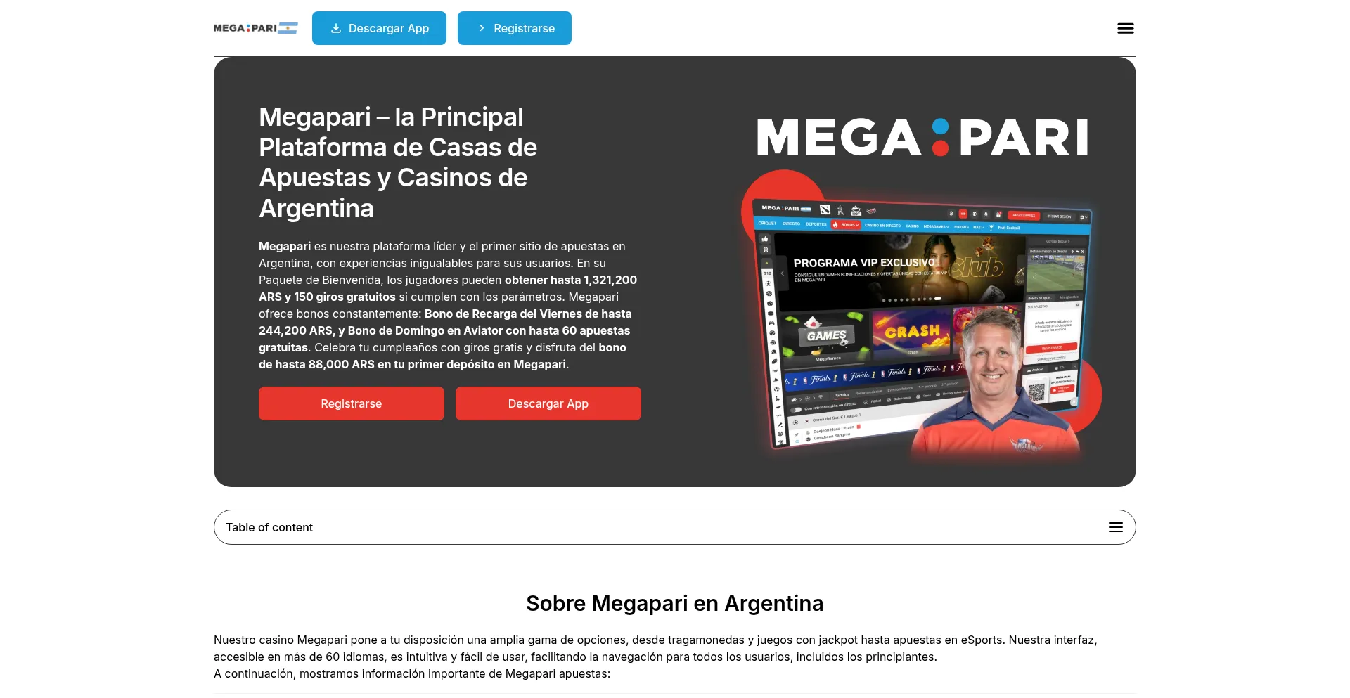 Únete a Megapari Argentina y recibe un 100% de bono hasta 88,000 ARS en tu primer depósito. Visita nuestro sitio web oficial, inicia sesión y disfruta de las mejores apuestas...