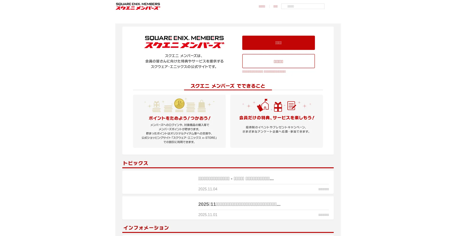 「スクエニ メンバーズ」は、会員の皆さんにお得な特典やサービスを提供している、スクウェア・エニックスの公式サイトです。