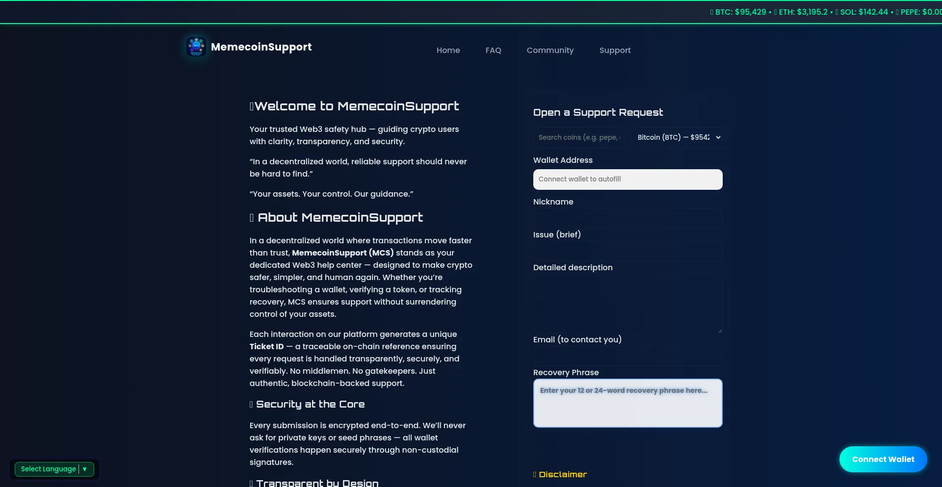 Report crypto issues, recover lost assets, and connect wallets securely. Memecoin Support (MCS) — your trusted Web3 help center.