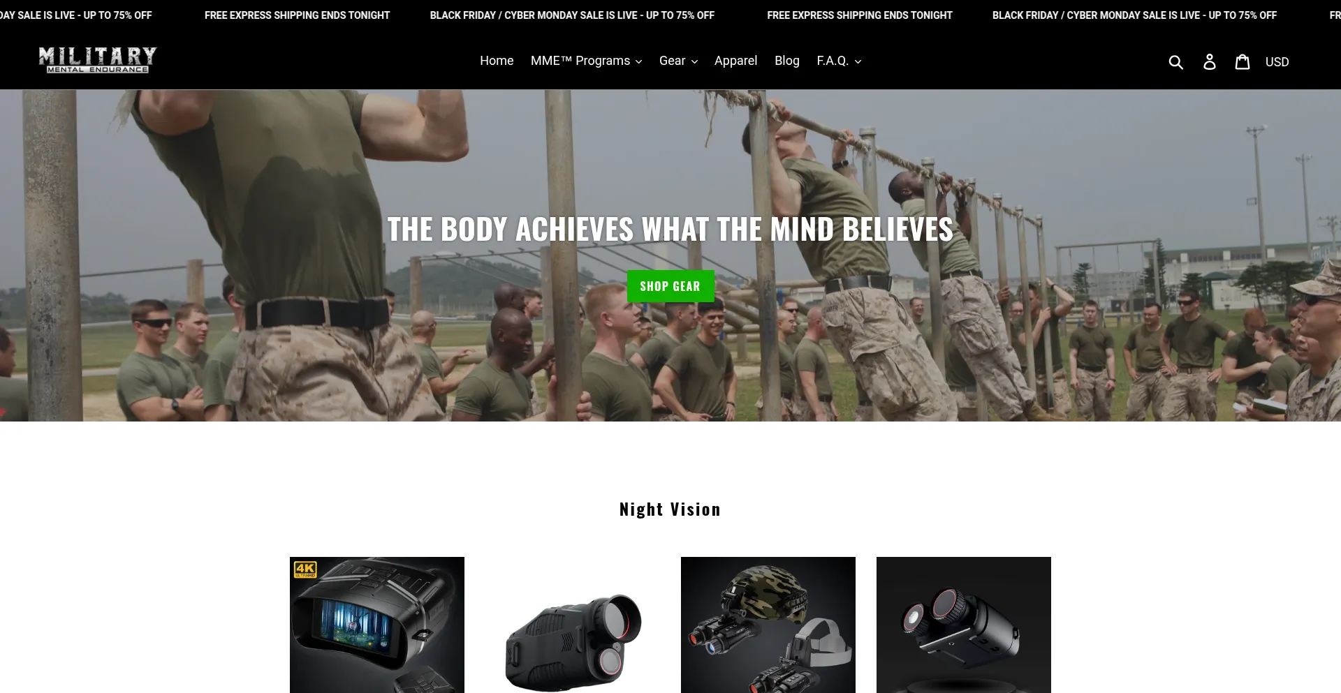 Analysis indicates that militarymentalendurance.com operates as an e-commerce platform facilitating online transactions for goods or services. The website implements shopping cart functionality, payment processing systems, and product catalog features typical of commercial retail operations.