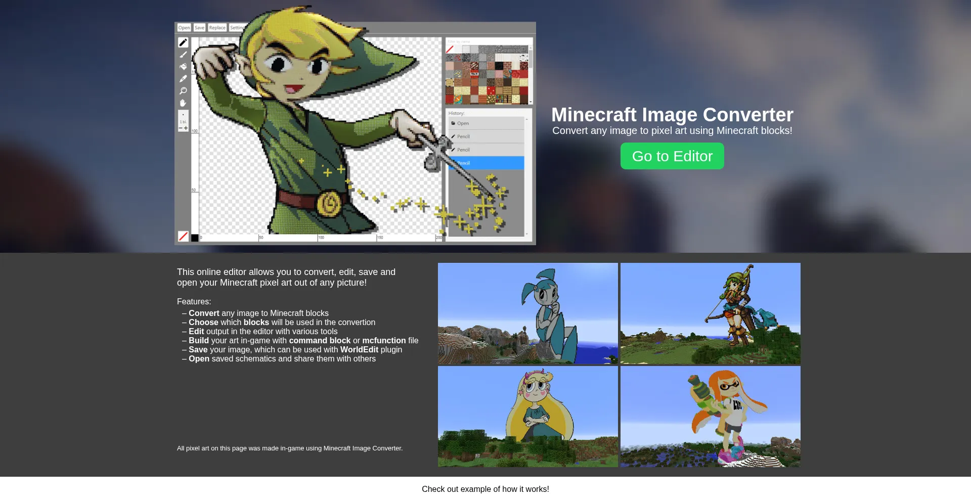 Convert any image to pixel art using Minecraft blocks! This site allows you to convert, edit, save and open your Minecraft pixel art out of any picture.