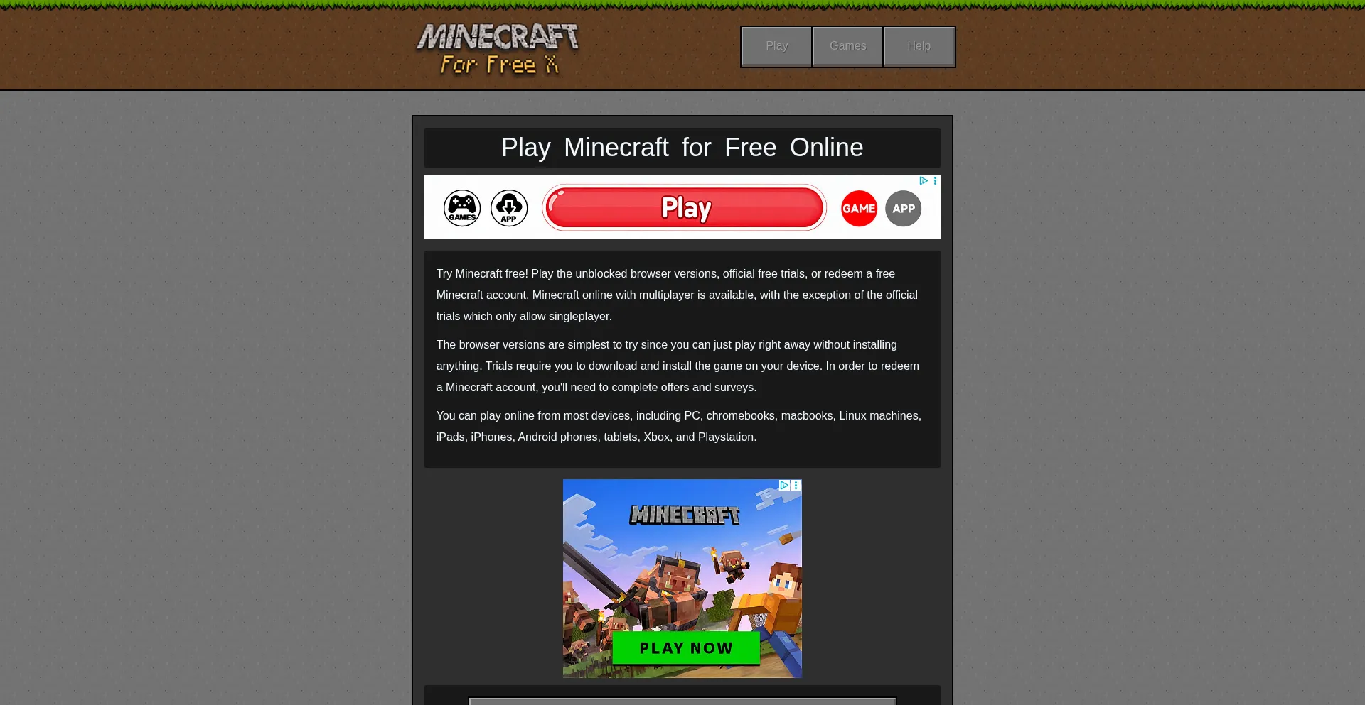 Play Minecraft unblocked for free on your browser. We provide multiplayer so you can play Minecraft online and join servers.