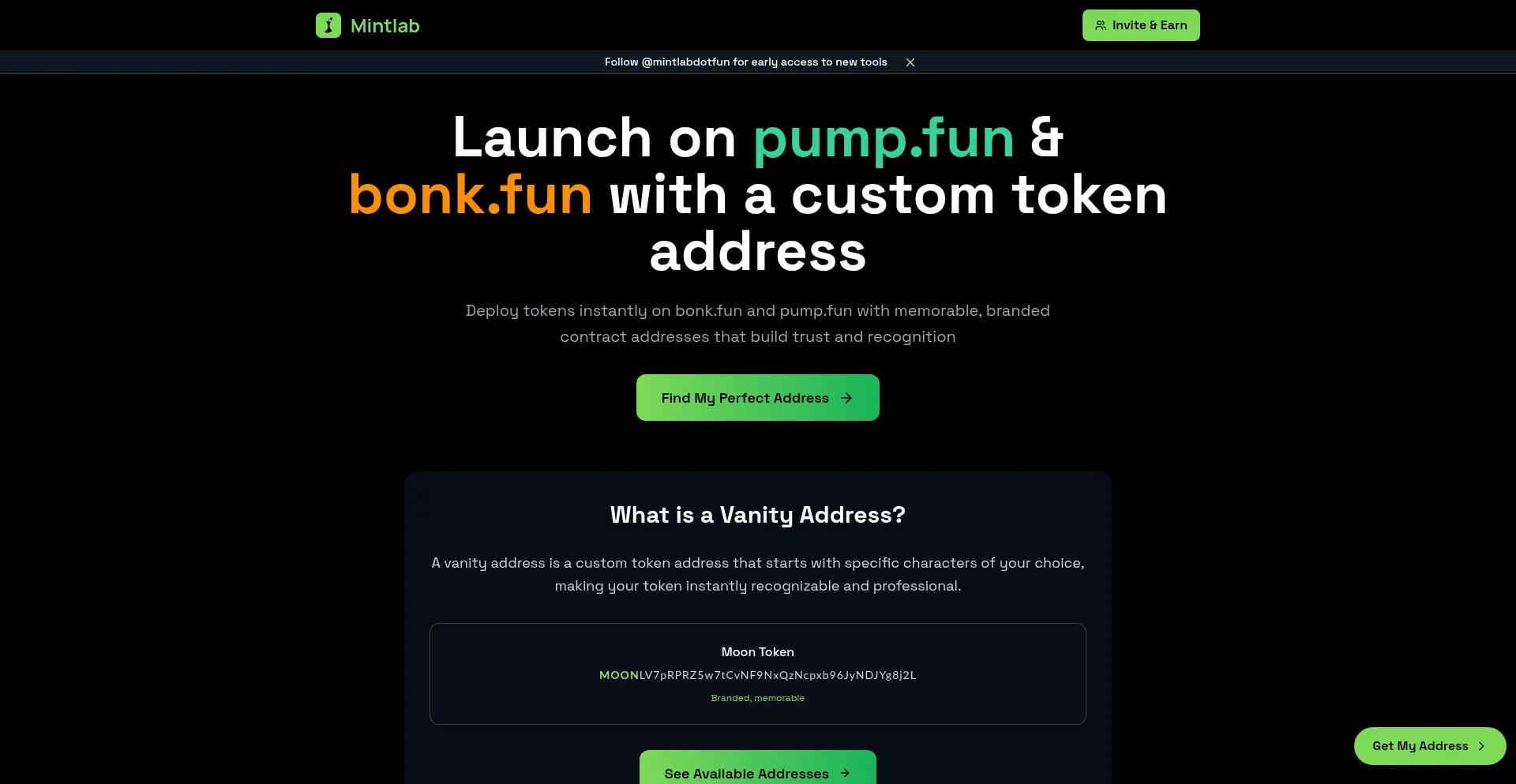 Deploy instantly on bonk.fun and pump.fun with vanity token addresses. No waiting times, know your CA beforehand, enjoy peace of mind. Get instant vanity CA deployment with Mint...