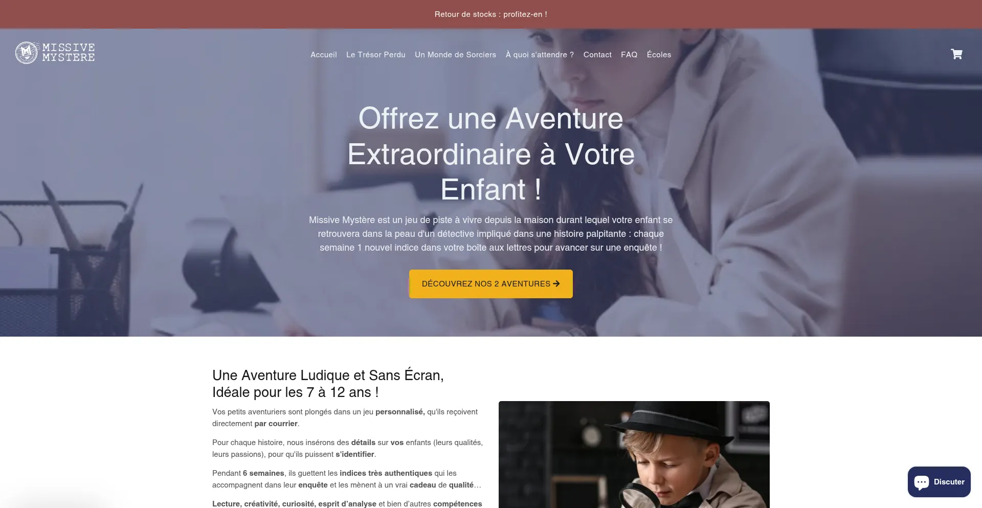 Analysis indicates that missivemystere.fr operates as an e-commerce platform facilitating online transactions for goods or services. The website implements shopping cart functionality, payment processing systems, and product catalog features typical of commercial retail operations.