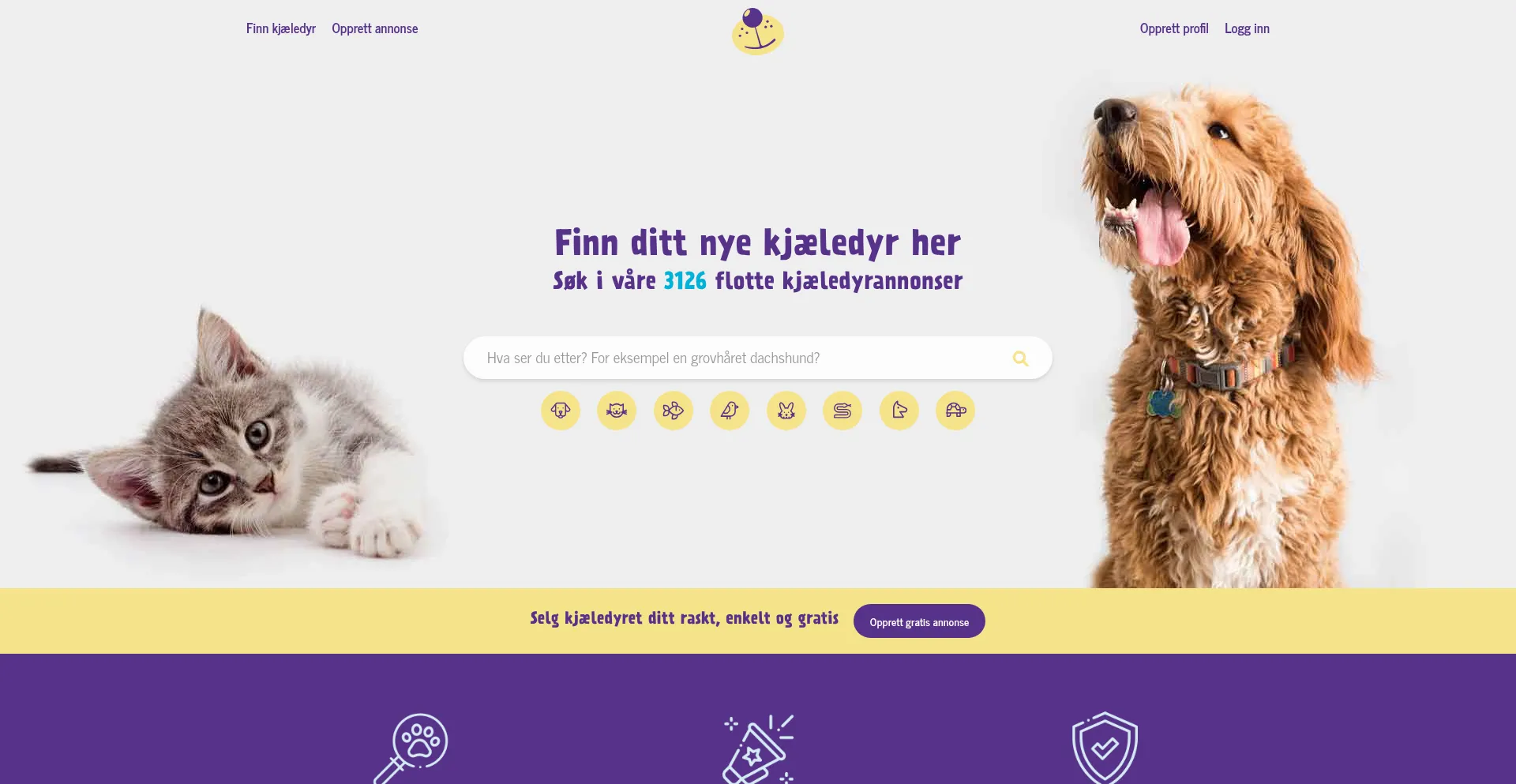 Finn hunder, katter og andre kjæledyr til salgs på Mitt-dyr.com. Trygt kjøp og salg i hele Norge – raskt, enkelt og dyrevennlig.
