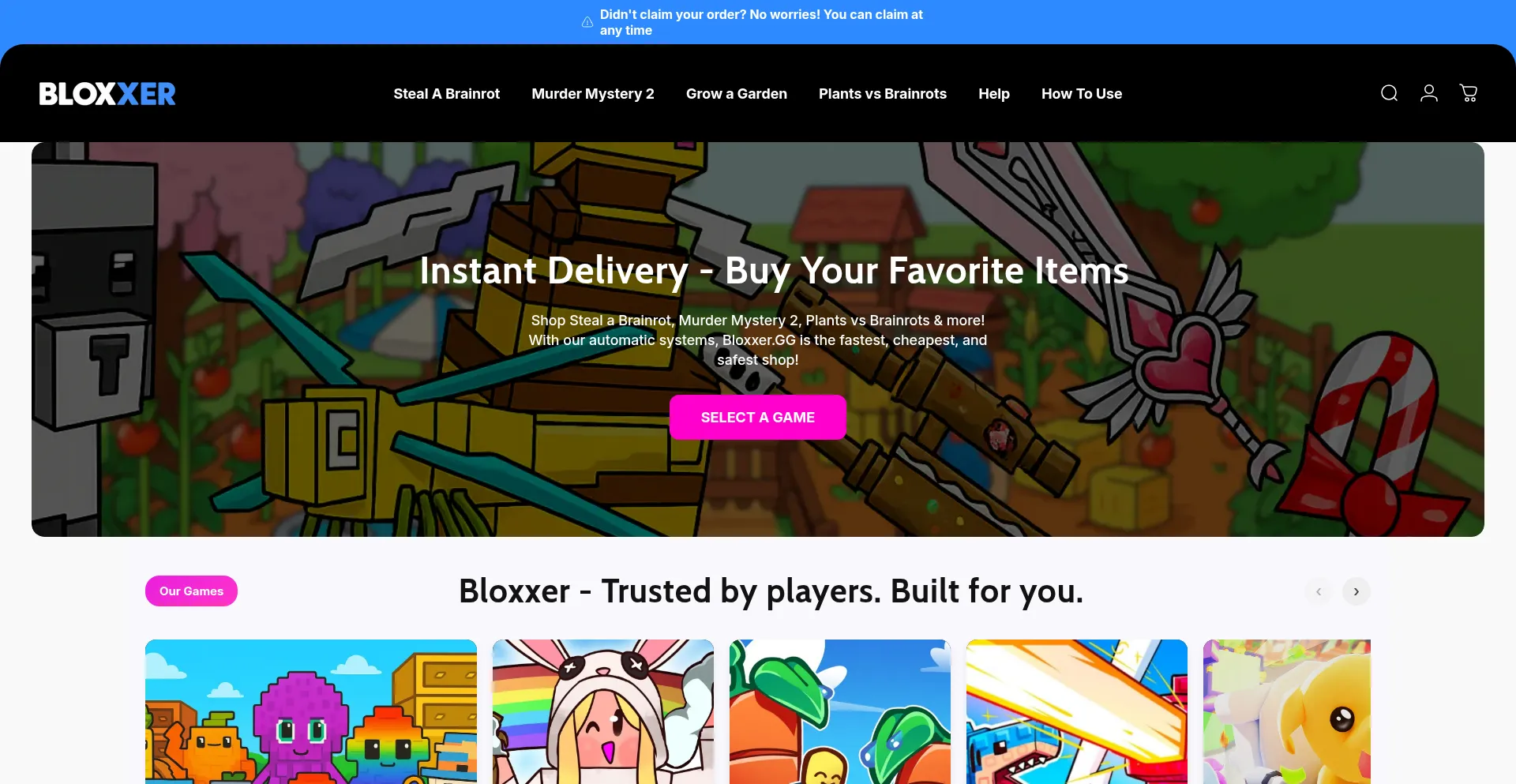 Shop Steal a Brainrot, Murder Mystery 2 Godlys, Grow a Garden, Plants vs Brainrots, Adopt Me & more instantly at BloxxerGG – the #1 trusted Brainrots, Grow a Garden Pets, Adop...
