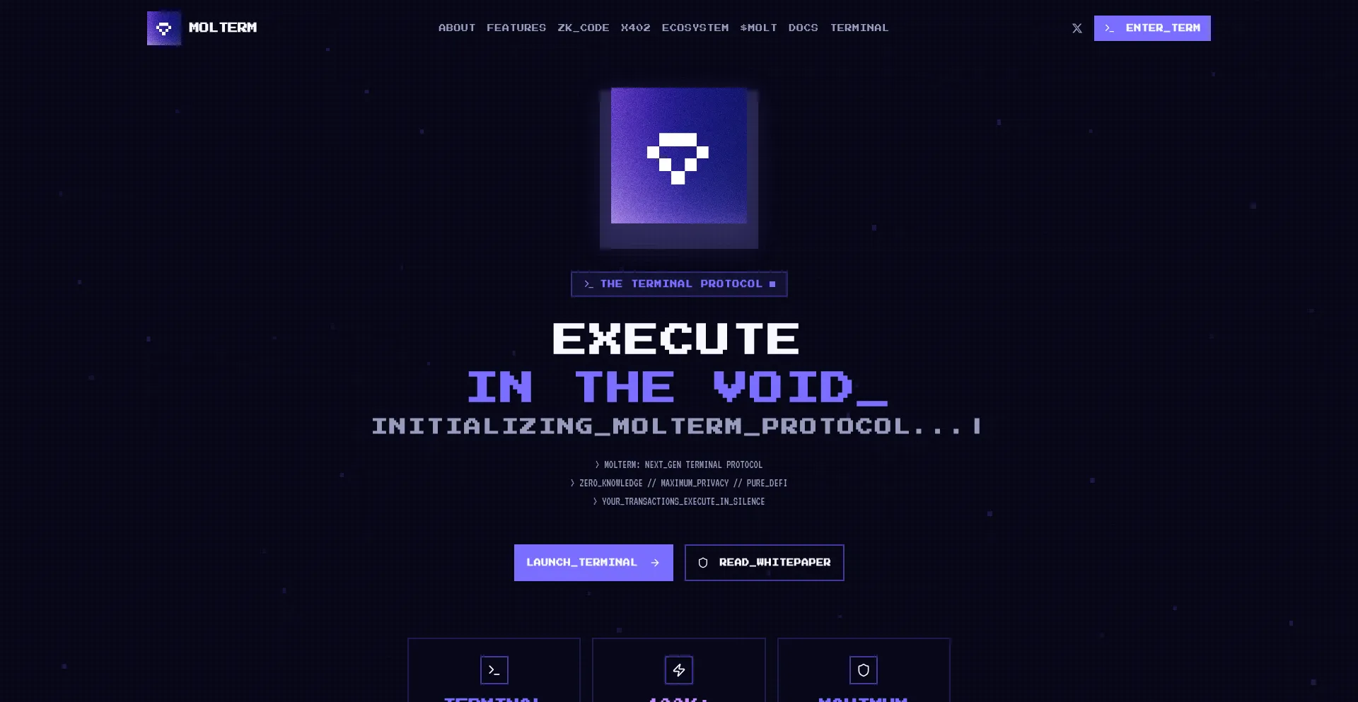 Enter the terminal. MolTerm is a next-generation privacy protocol where transactions execute in the void. Zero-knowledge. Maximum privacy. Pure DeFi.