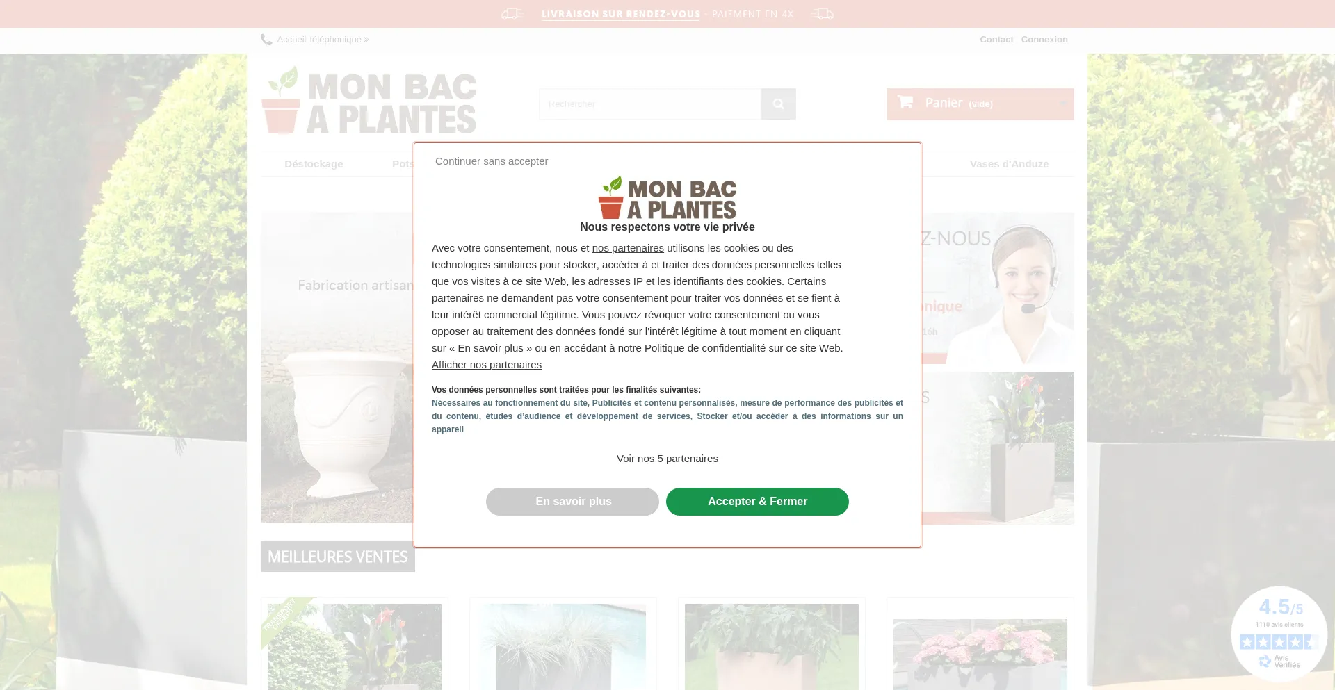 Tous les bacs à plantes sont chez Mon Bac à Plantes : bacs en fibre de terre, fibre de verre, bacs en bois, bacs en métal, bacs en résine, bacs en terre cuite, vases d'Anduze