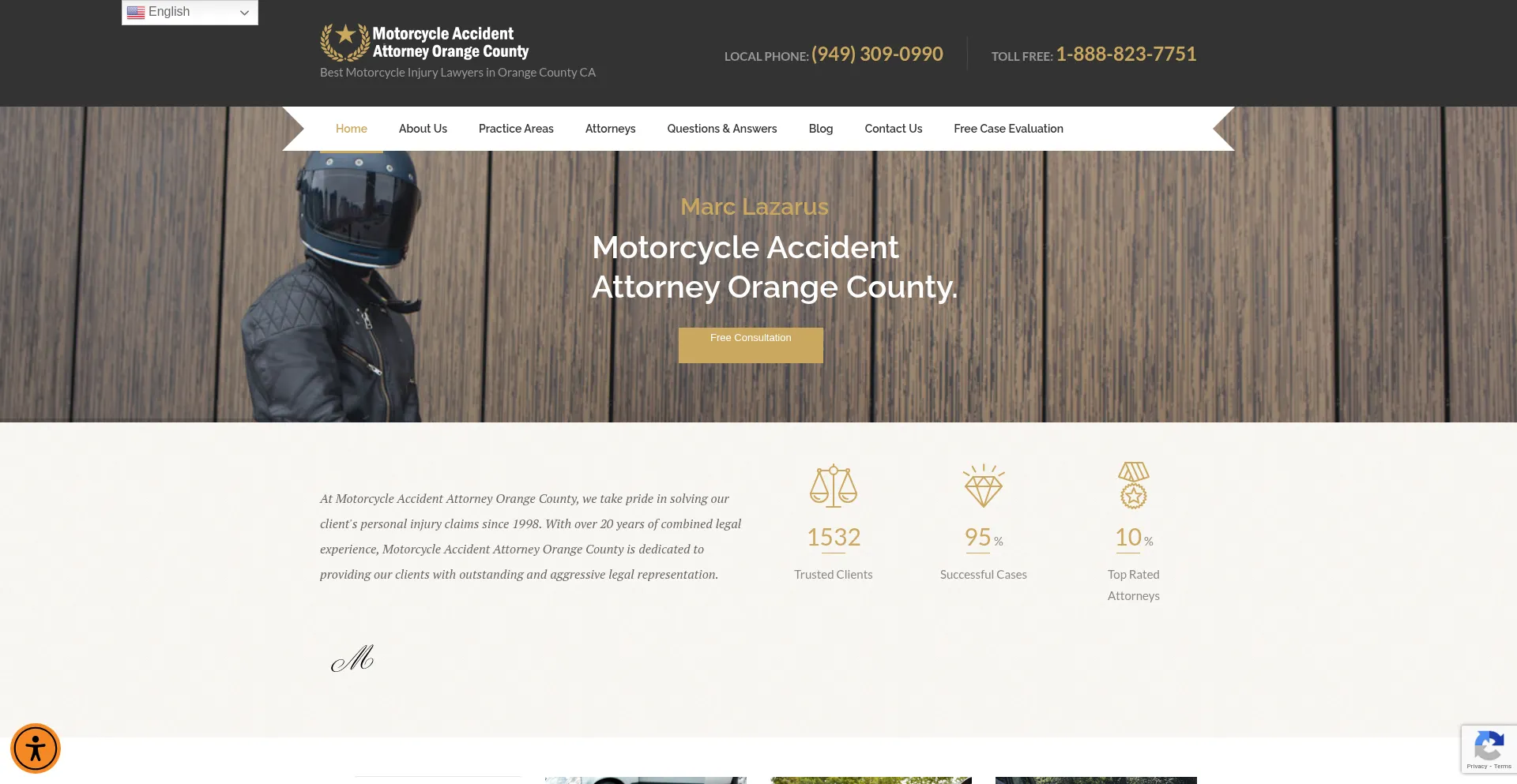 The motorcycleaccidentattorneyoc.com website employs search engine optimization (SEO) techniques to improve its visibility and ranking in search engine results pages (SERPs).